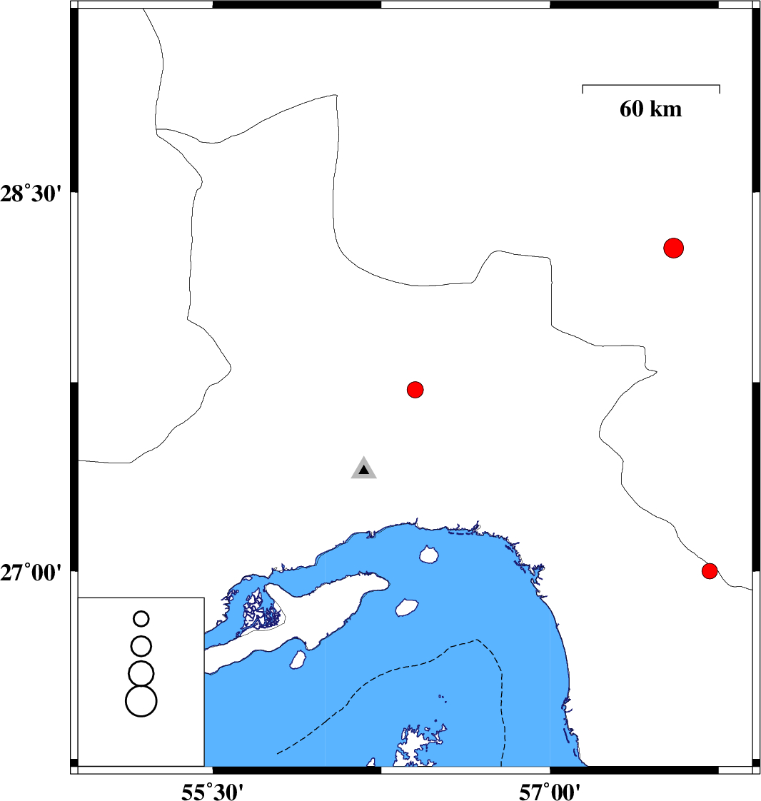 2010/09/26 | 07:28:38.6 | 10:58:38.6 | 28.28 | 57.55 | 15 | ML:3.9 | Kerman Province, 40 km North-West of Kahnuj |
