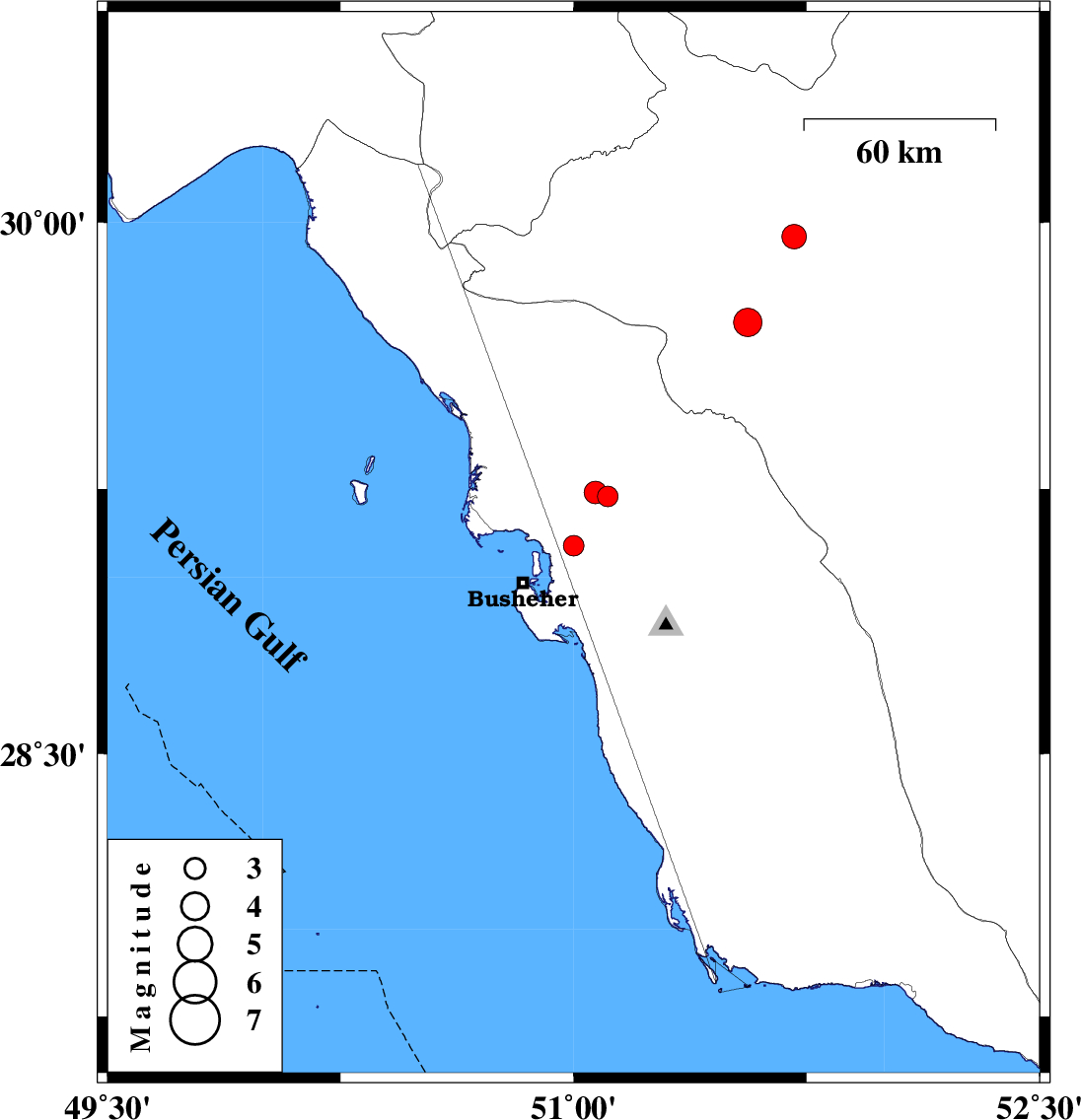 2010/10/08 | 22:28:57.1 | 01:58:57.1 | 29.09 | 51 | 30 | ML:2.9 | Bushehr Province, 20 km North-East of Busheher | ||