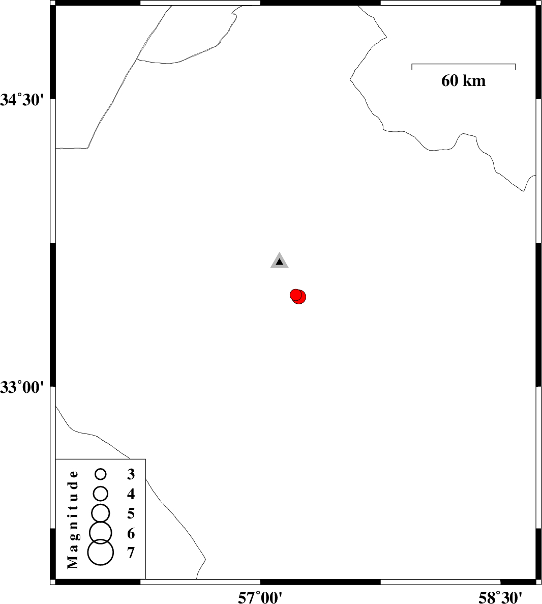 | 2010/10/06 | 23:47:58.2 | 03:17:58.2 | 33.47 | 57.24 | 15 | ML:4 | Yazd Province, 32 km South-East of Tabas |