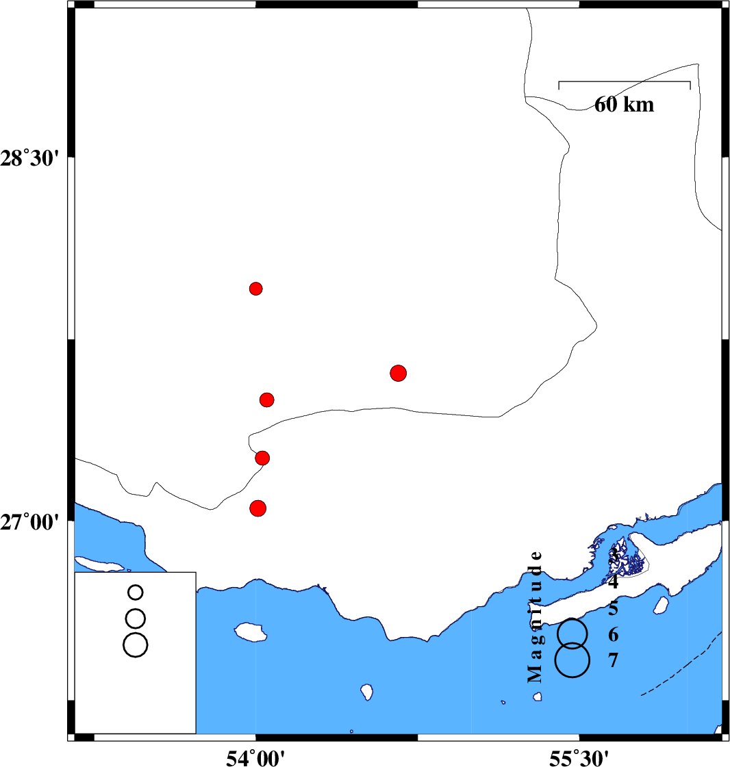 2010/09/27 | 05:53:42.5 | 09:23:42.5 | 26.7 | 53.53 | 46 | ML:3.5 | Persian Gulf, 79 km South-East of Lamerd | ||