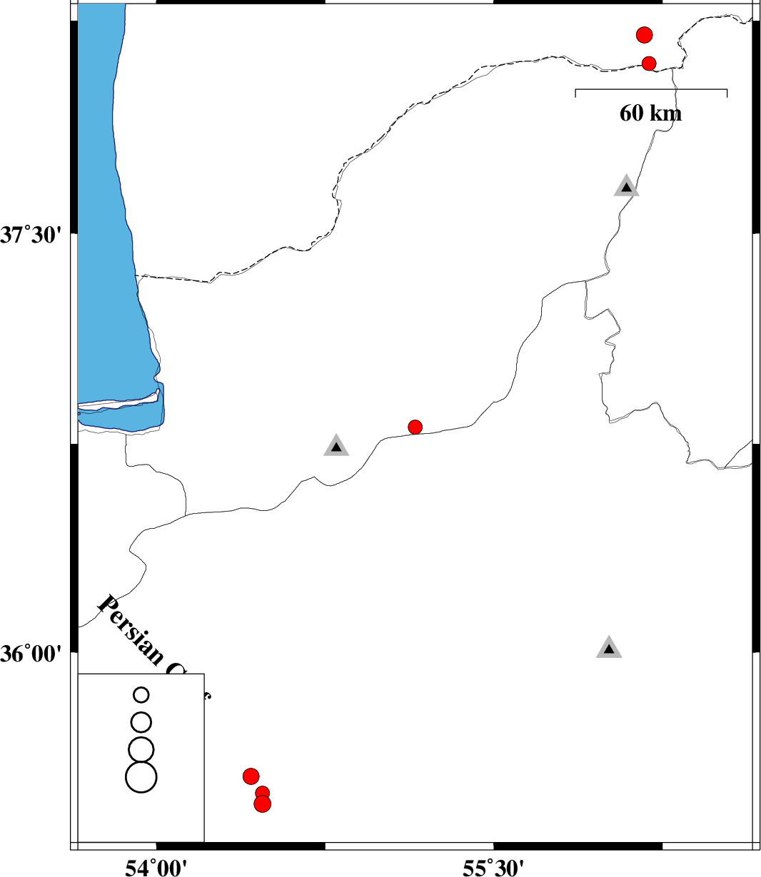 | 2010/10/13 | 13:27:56.9 | 16:57:56.9 | 35.45 | 54.47 | 14 | ML:3.4 | Semnan Province, 81 km South-East of Damghan | ||