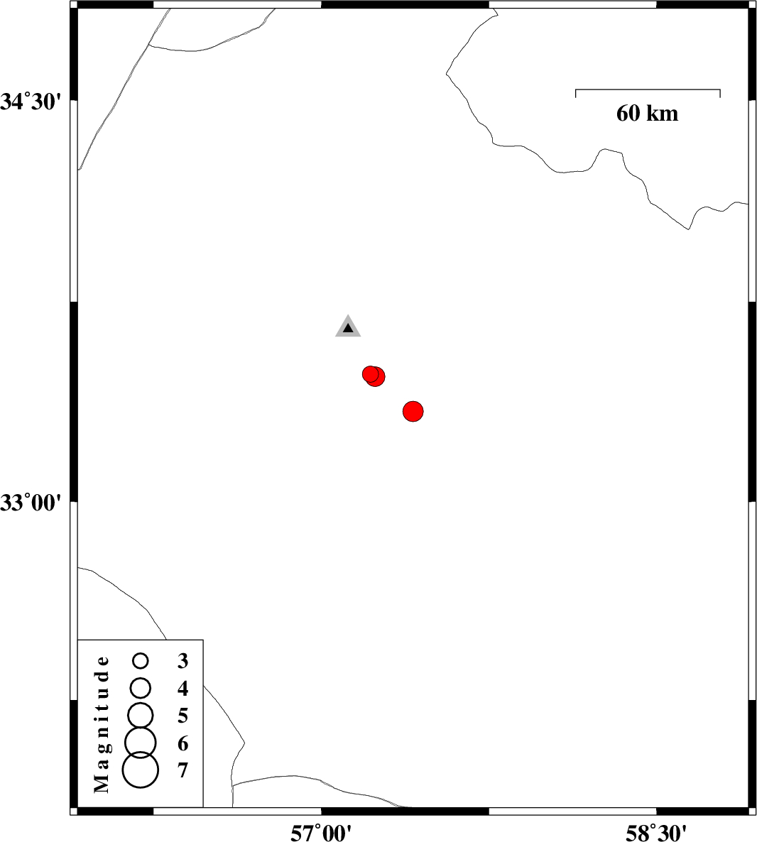 | 2010/10/06 | 23:47:58.2 | 03:17:58.2 | 33.47 | 57.24 | 15 | ML:4 | Yazd Province, 32 km South-East of Tabas |