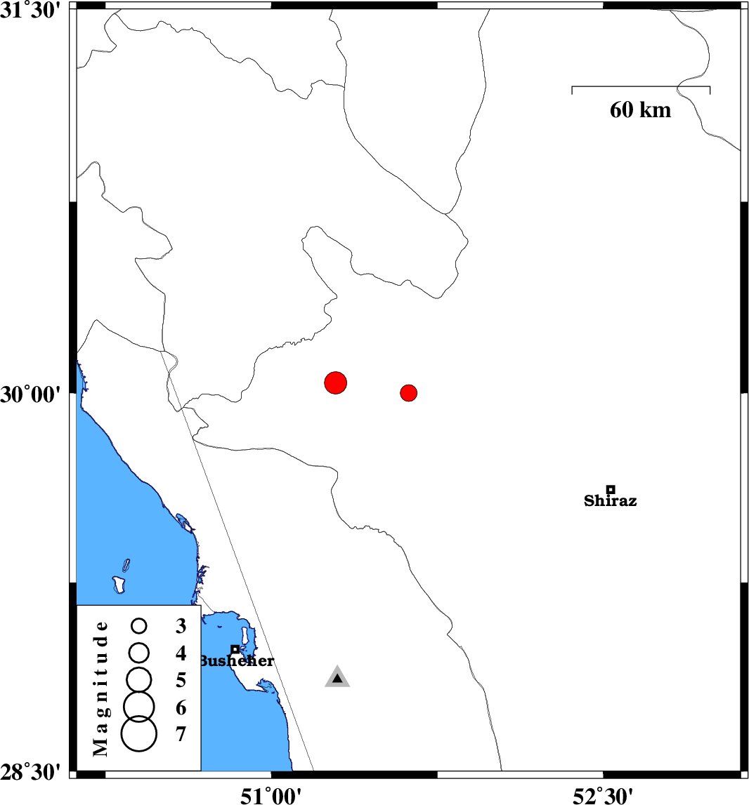 | 2010/10/28 | 09:22:22.4 | 12:52:22.4 | 30.04 | 51.29 | 17 | ML:4.5 | Fars Province, 24 km West of Nurabad |