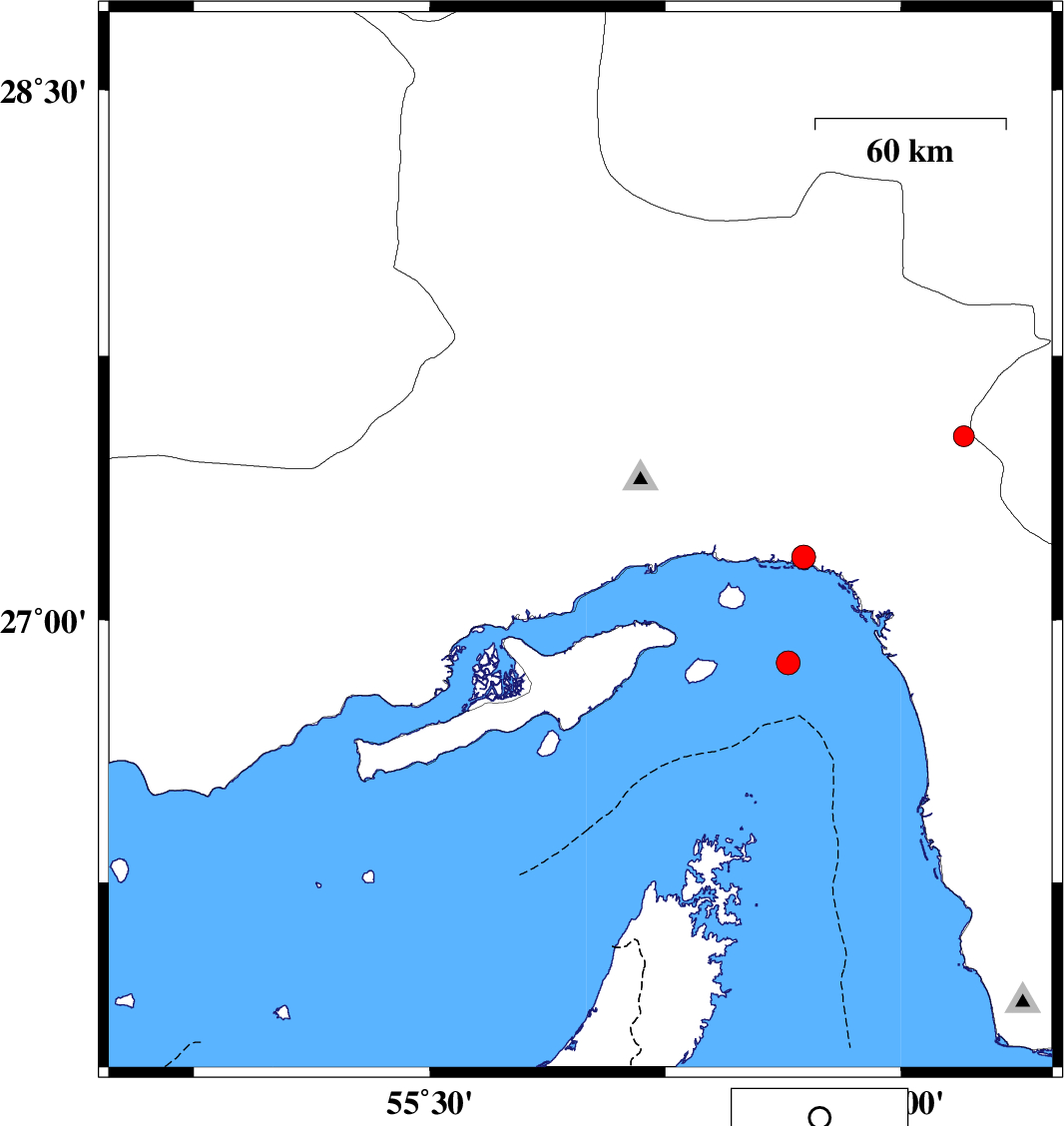 2010/10/28 | 13:56:11.7 | 17:26:11.7 | 27.22 | 55.98 | 7 | ML:3.4 | Hormozgan Province, 30 km West of Bandar-e abbas | ||