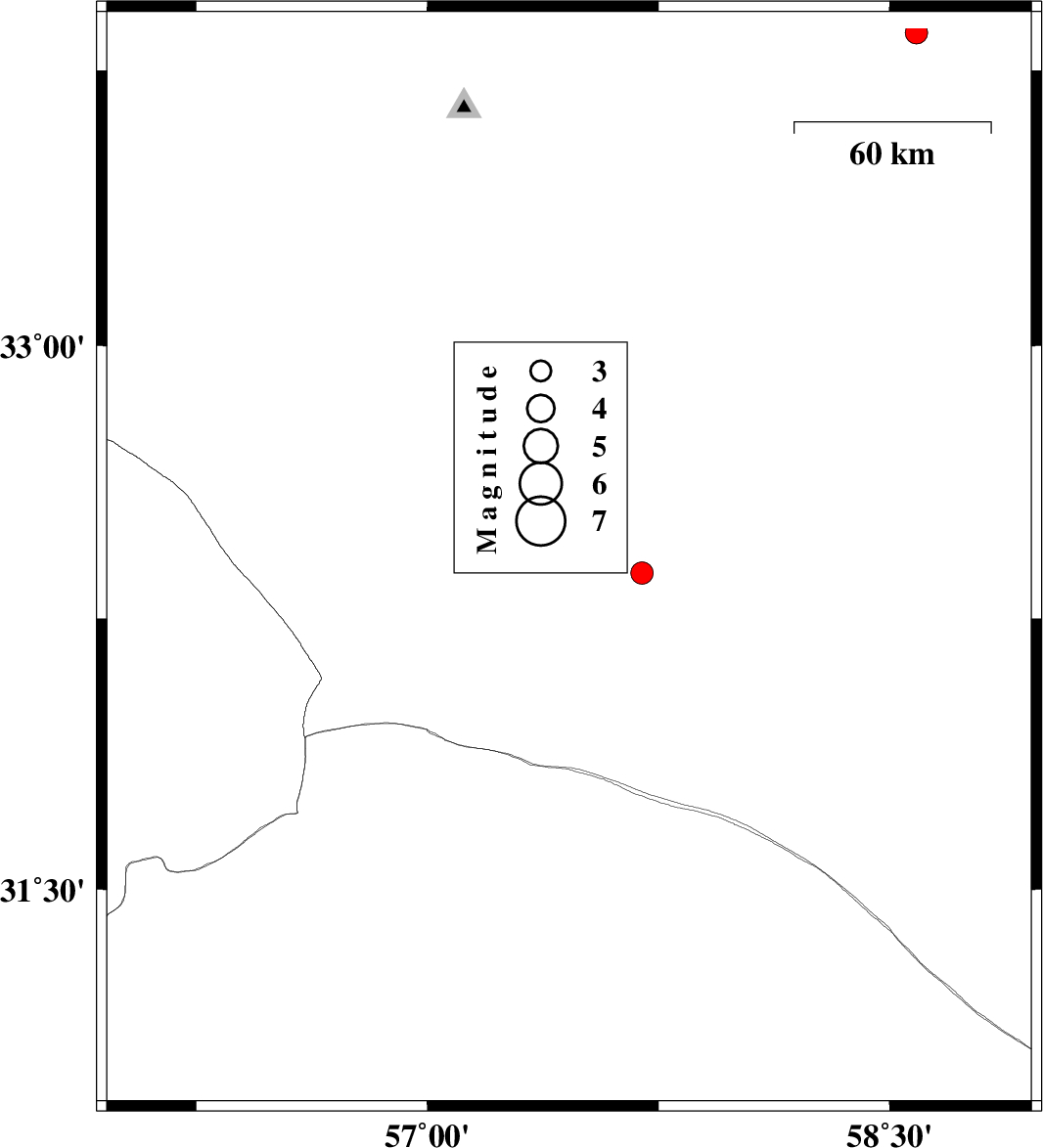 2010/10/06 | 23:47:58.2 | 03:17:58.2 | 33.47 | 57.24 | 15 | ML:4 | Yazd Province, 32 km South-East of Tabas |