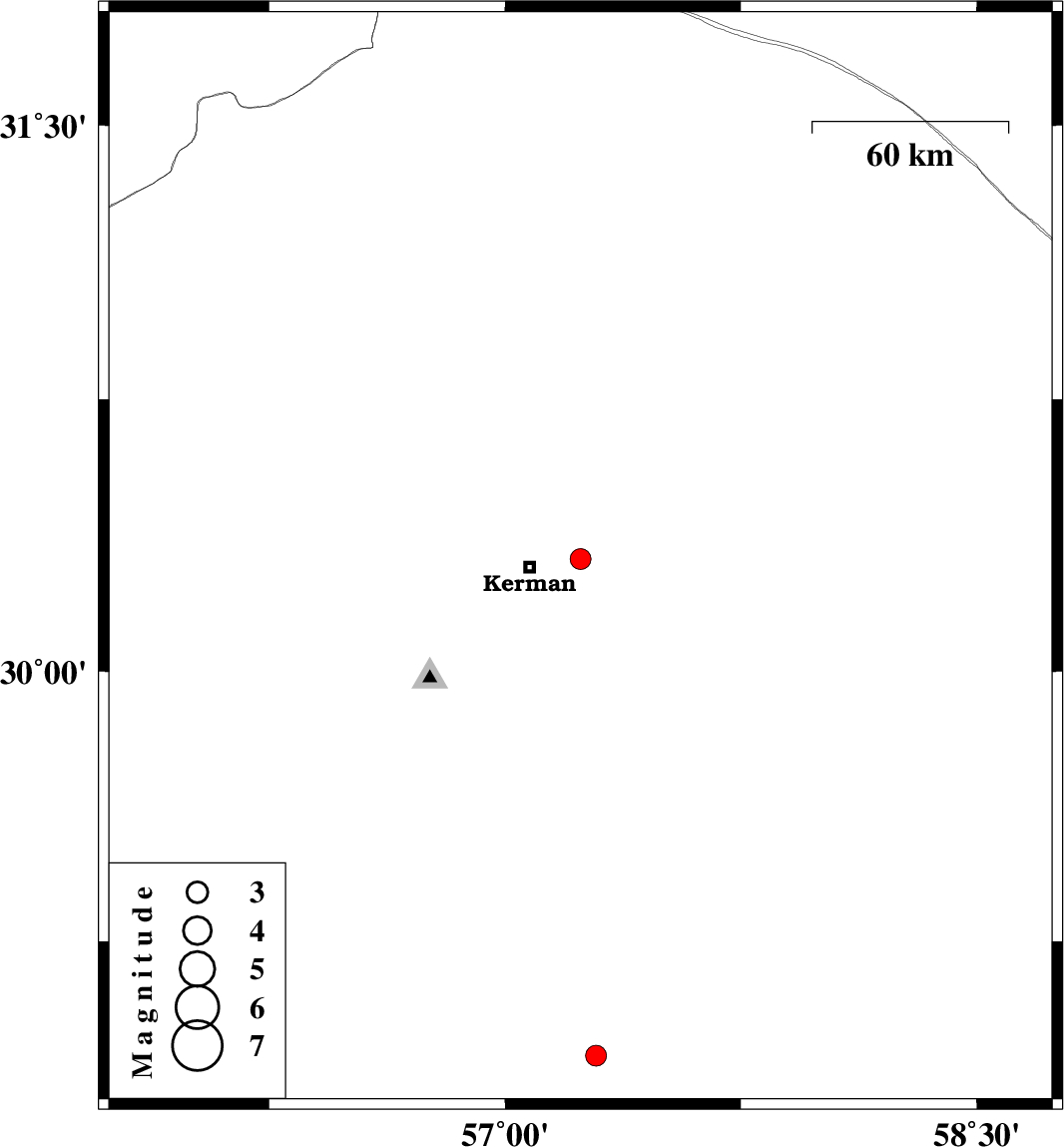 | 2010/10/25 | 05:09:30.8 | 08:39:30.8 | 28.93 | 57.29 | 18 | ML:2.9 | Kerman Province, 52 km North-West of Jiroft |