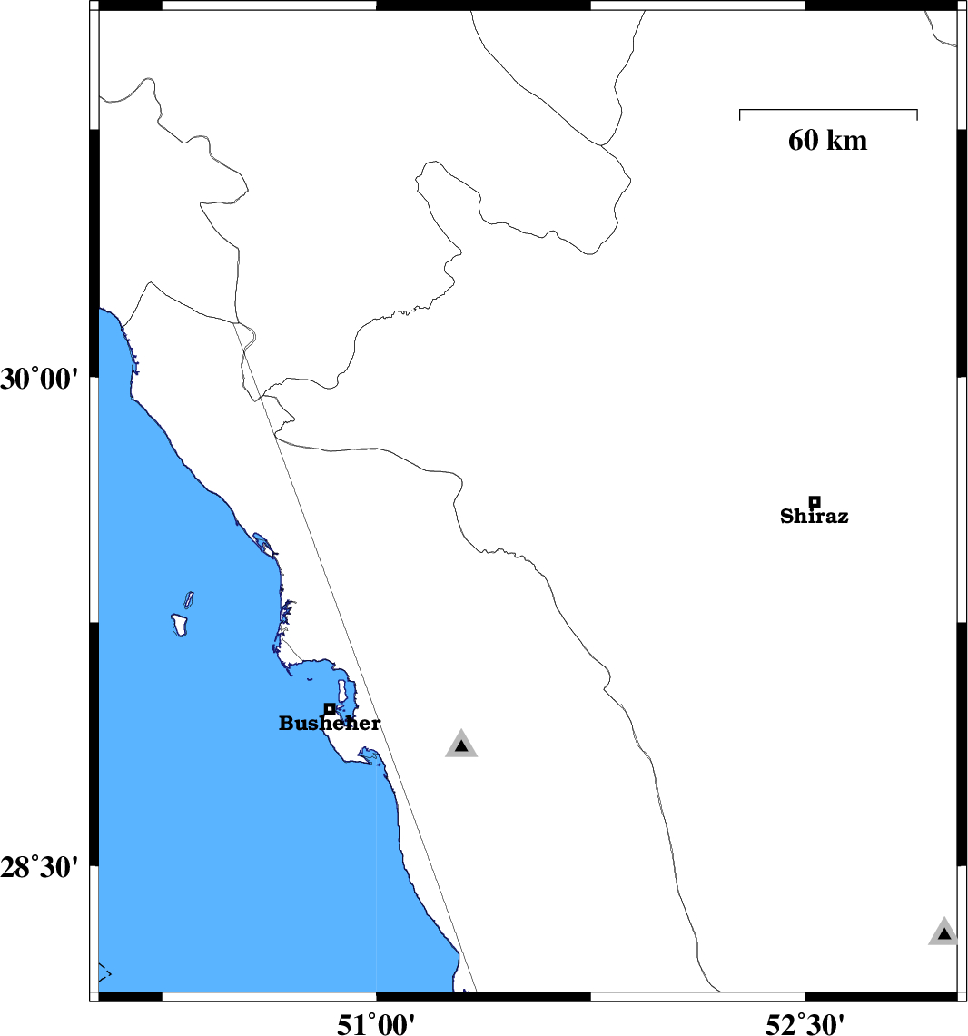 2010/11/02 | 21:53:10.0 | 01:23:10.0 | 29.59 | 51.51 | 17 | ML:3.8 | Fars Province, 15 km West of Kazerun | ||