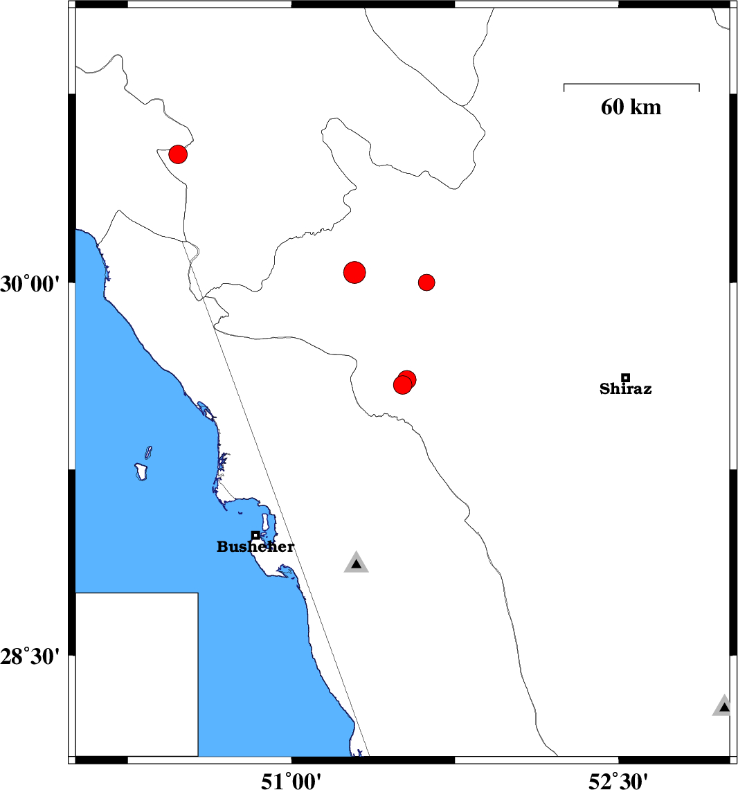 2010/11/02 | 17:41:50.5 | 21:11:50.5 | 29.61 | 51.53 | 14 | ML:3.8 | Fars Province, 12 km West of Kazerun | ||