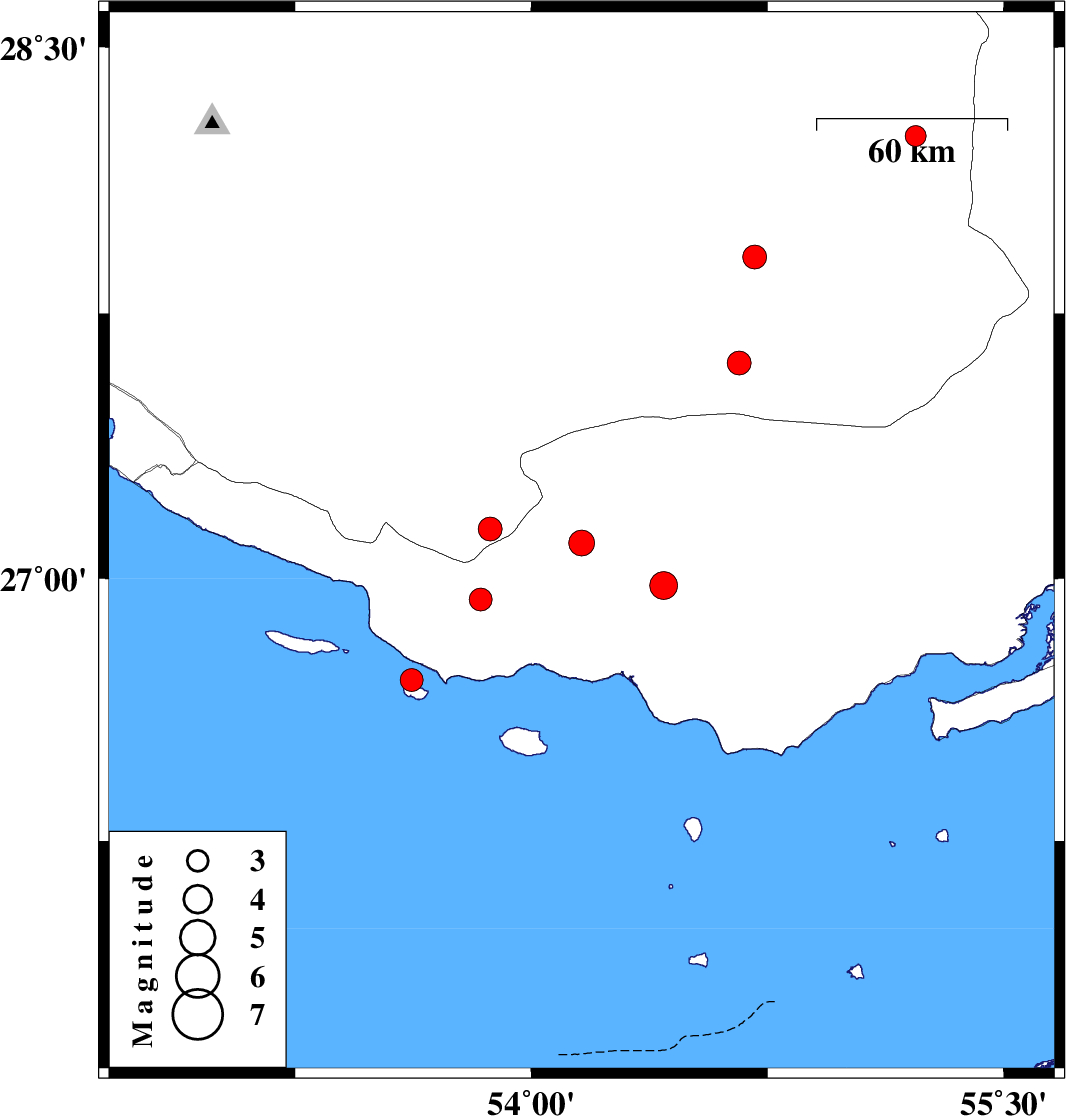 | 2010/11/01 | 08:34:45.3 | 12:04:45.3 | 26.71 | 53.62 | 46 | ML:3.3 | Persian Gulf, 83 km South-East of Lamerd | ||