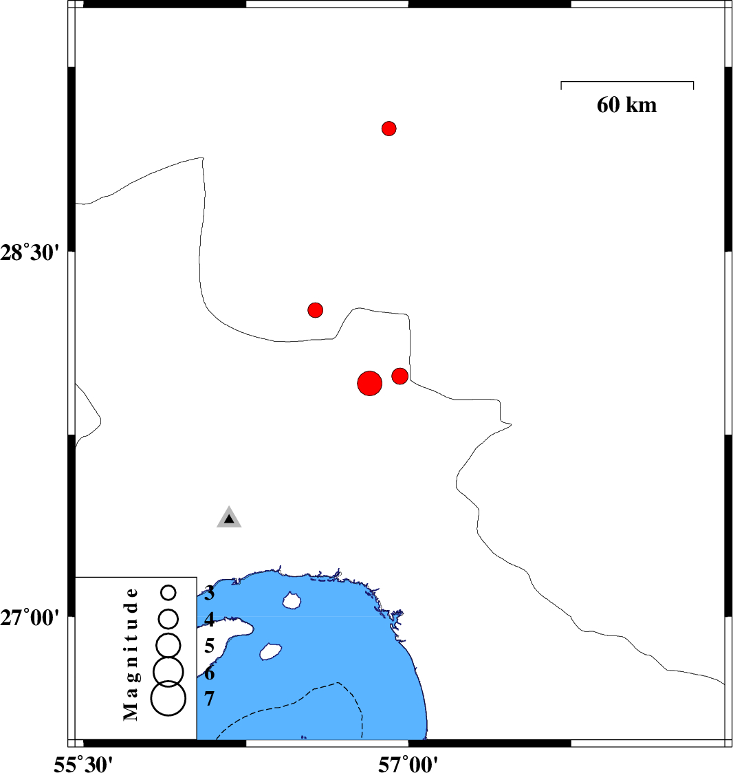 2010/11/08 | 11:14:57.4 | 14:44:57.4 | 28.26 | 56.57 | 14 | ML:3.1 | Kerman Province, 65 km East of Hajiabad | ||