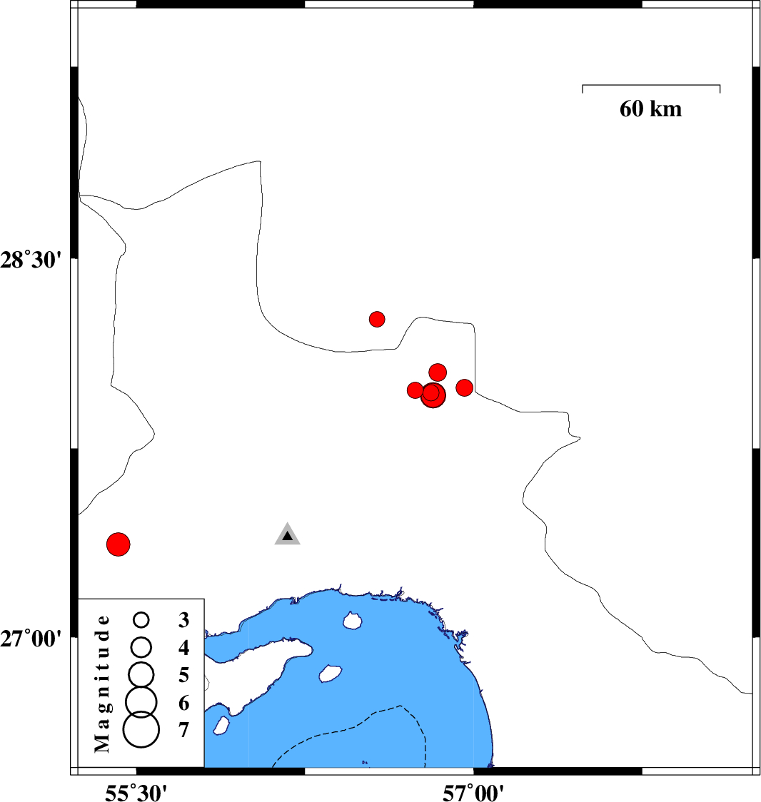 | 2010/11/11 | 13:19:49.5 | 16:49:49.5 | 28.05 | 56.84 | 15 | ML:3.5 | Hormozgan Province, 85 km West of Kahnuj | ||