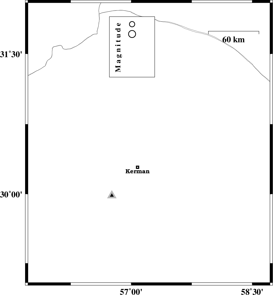 2010/11/13 | 08:36:43.6 | 12:06:43.6 | 31.82 | 56.7 | 31 | ML:2.9 | Kerman Province, 63 km North-West of Ravar | ||