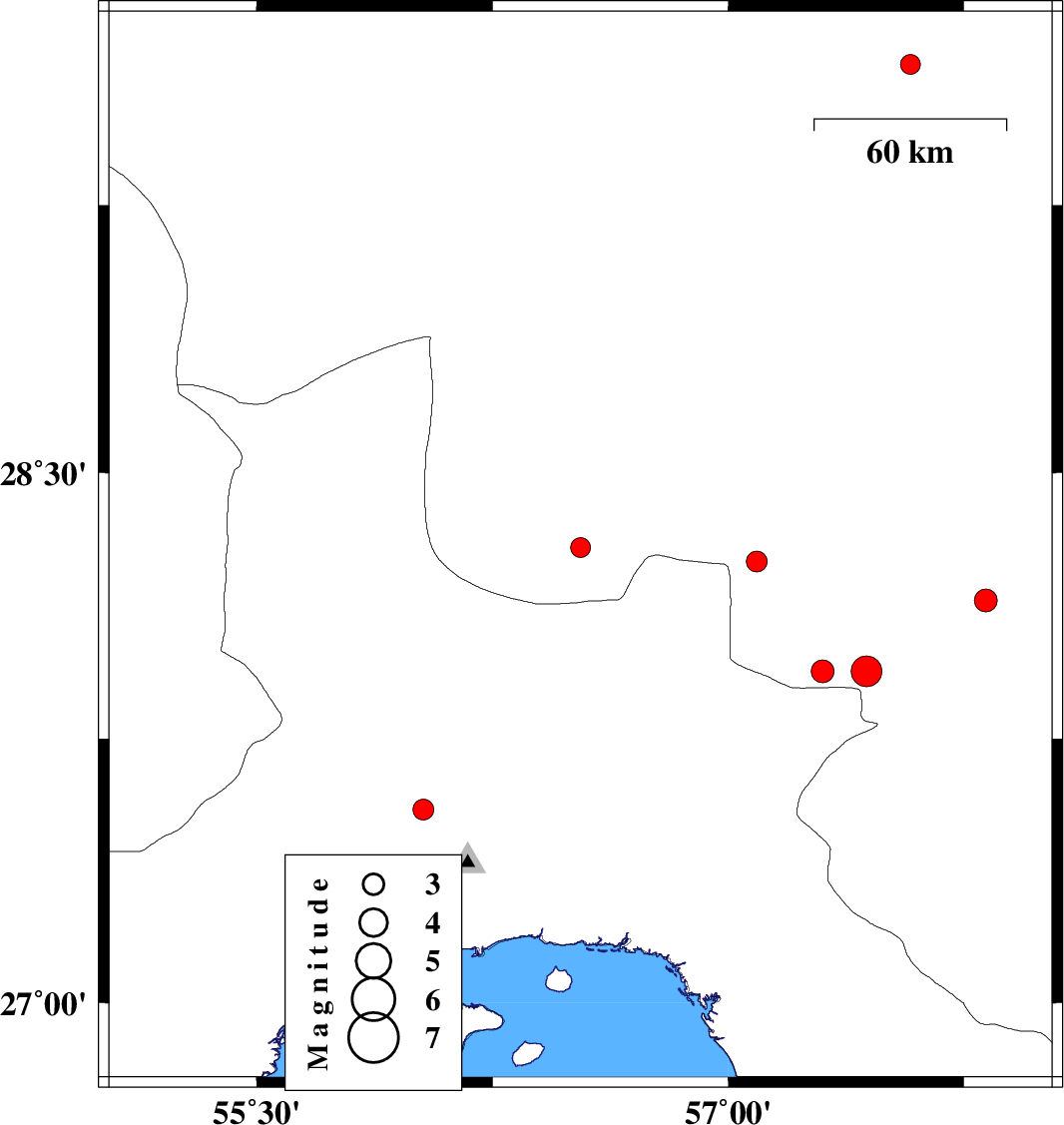 2010/11/13 | 05:26:47.1 | 08:56:47.1 | 27.98 | 56.74 | 41 | ML:3.2 | Hormozgan Province, 93 km West of Kahnuj |