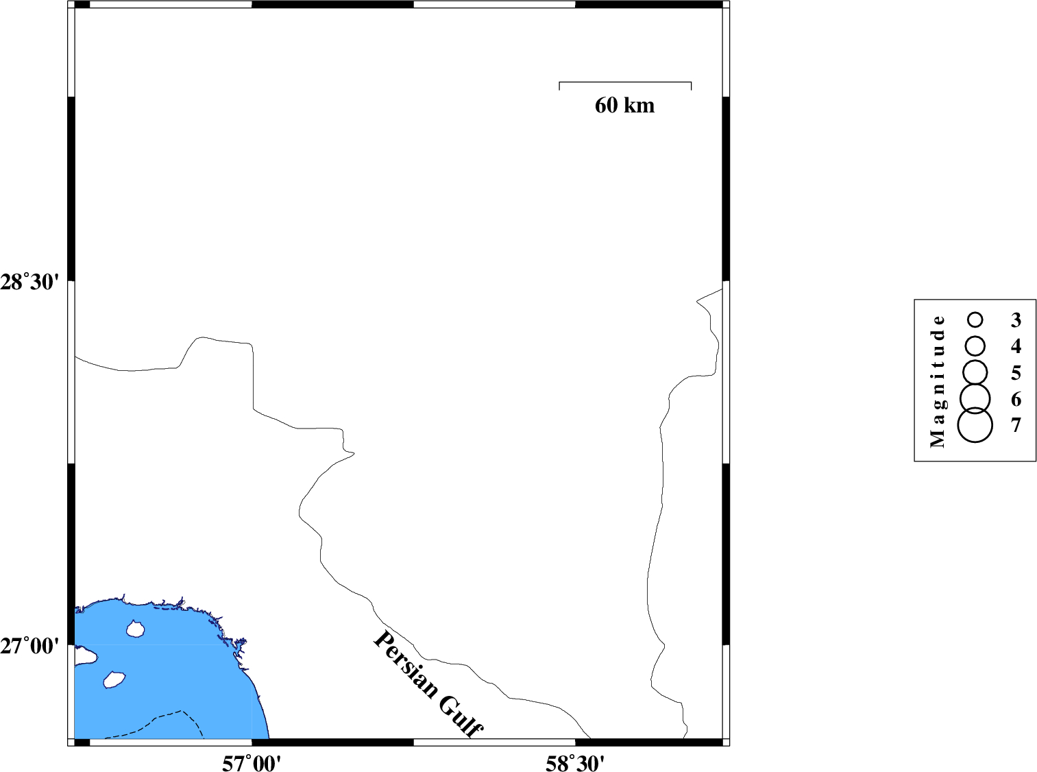 2010/11/19 | 16:04:31.9 | 19:34:31.9 | 28.11 | 57.68 | 46 | ML:3 | Kerman Province, 18 km North of Kahnuj | ||