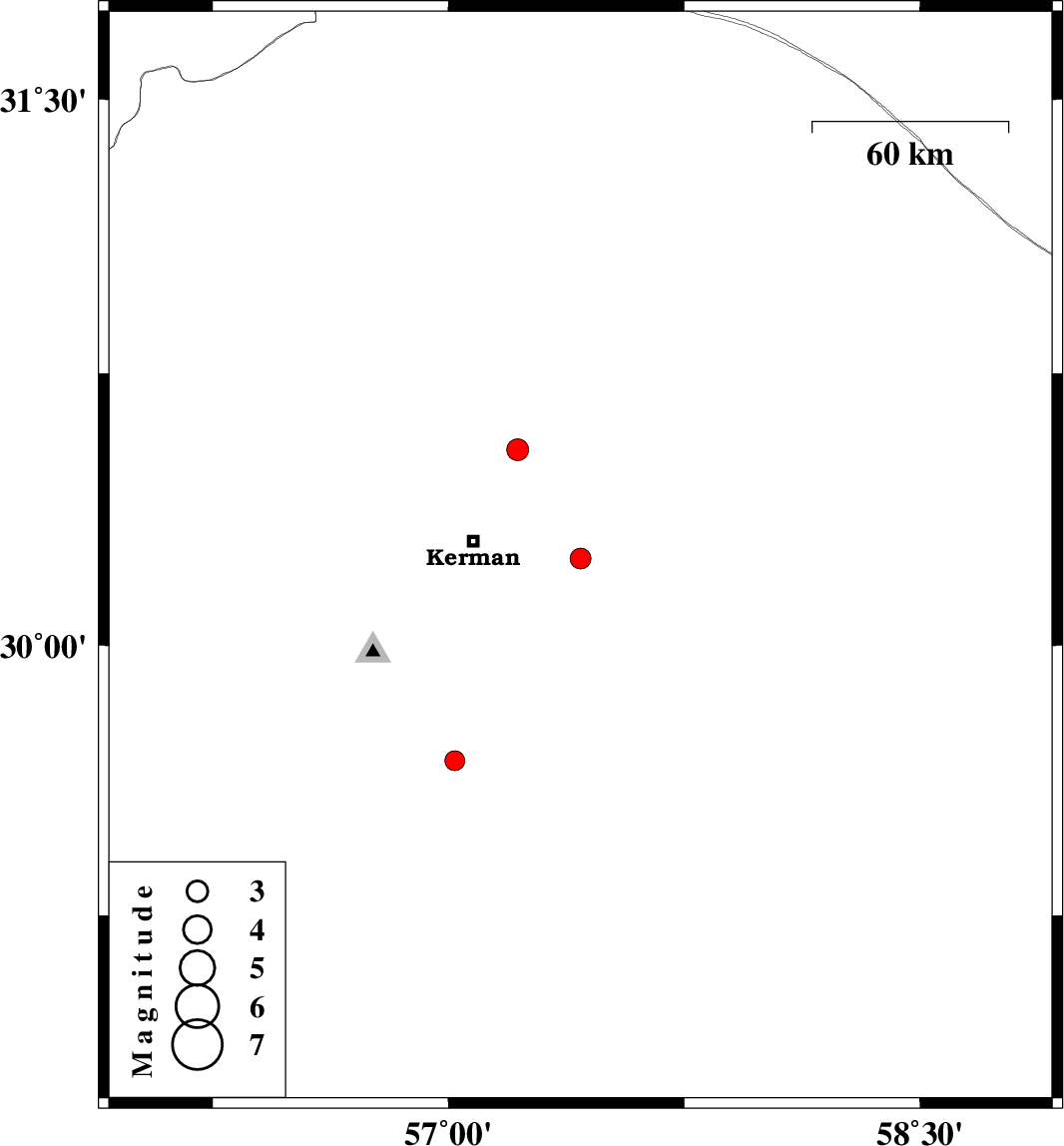 | 2010/11/17 | 10:14:02.6 | 13:44:02.6 | 30.54 | 57.22 | 15 | ML:3.1 | Kerman Province, 31 km North-East of Kerman |