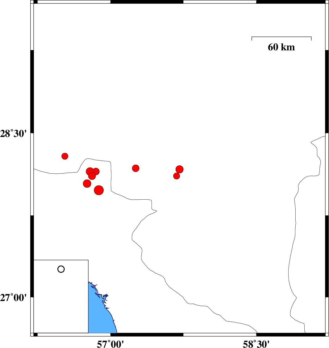 | 2010/11/19 | 16:04:31.9 | 19:34:31.9 | 28.11 | 57.68 | 46 | ML:3 | Kerman Province, 18 km North of Kahnuj | ||