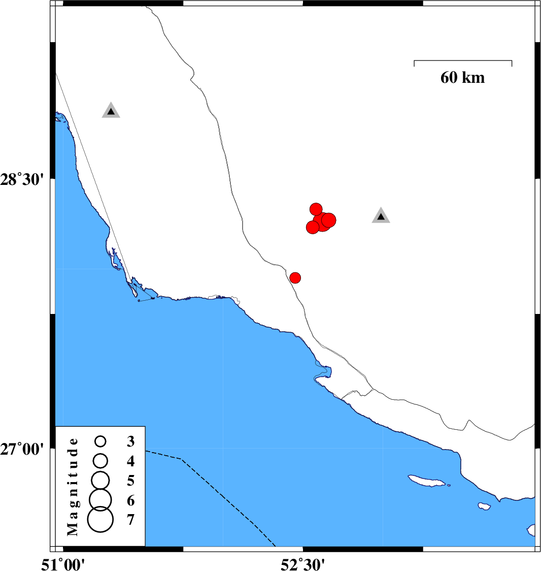 2010/11/26 | 12:33:44.5 | 16:03:44.5 | 28.26 | 52.62 | 9 | ML:5.4 | Fars Province, 63 km South of Firuz Abad |
