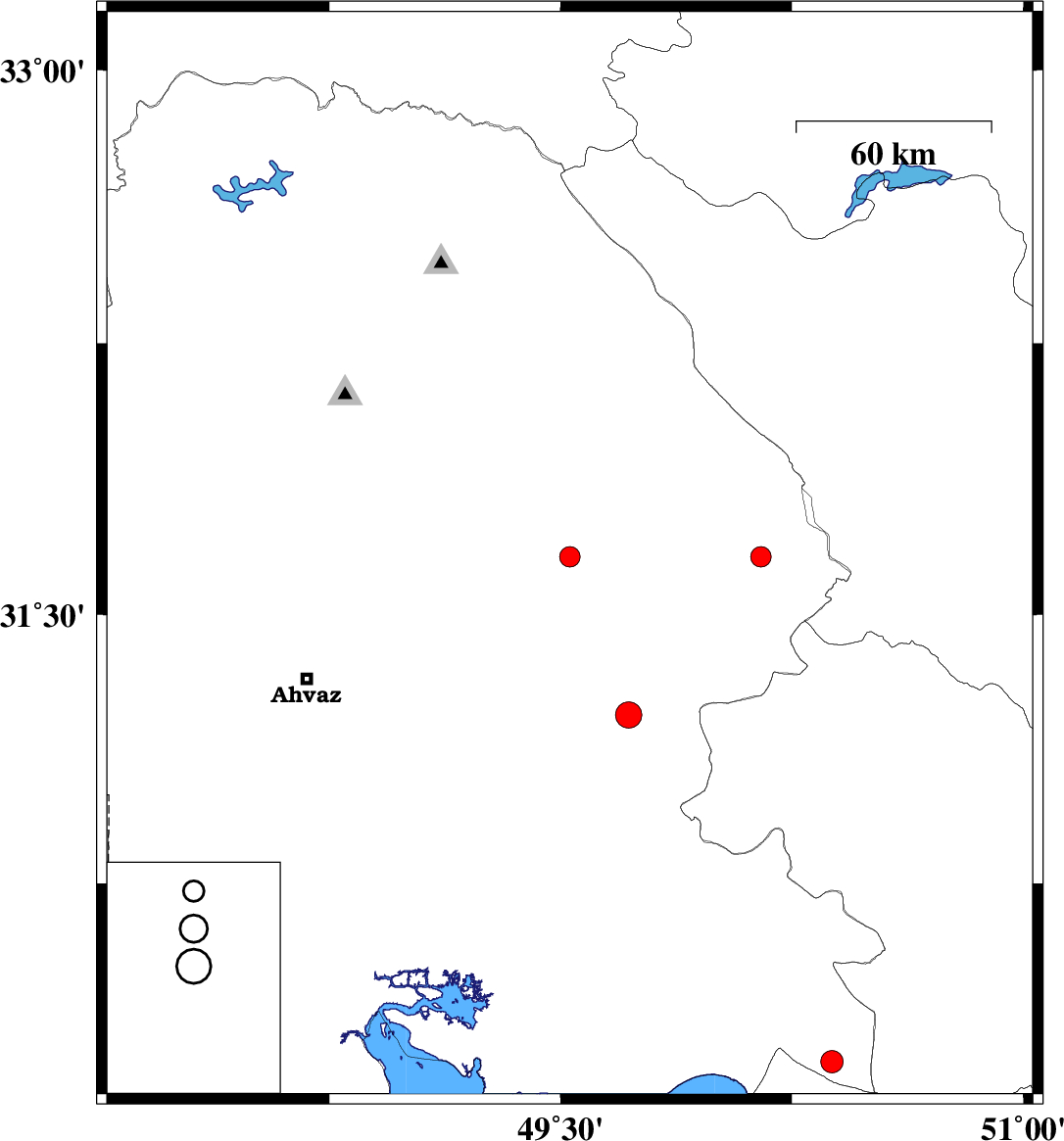 | 2010/11/26 | 01:07:02.4 | 04:37:02.4 | 31.22 | 49.72 | 33 | ML:3.8 | Khoozestan Province, 12 km East of Ramhormoz |