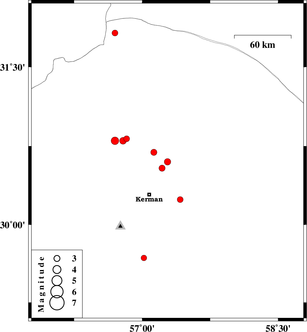 | 2010/11/20 | 02:39:52.5 | 06:09:52.5 | 30.24 | 57.42 | 6 | ML:3 | Kerman Province, 33 km East of Kerman | ||