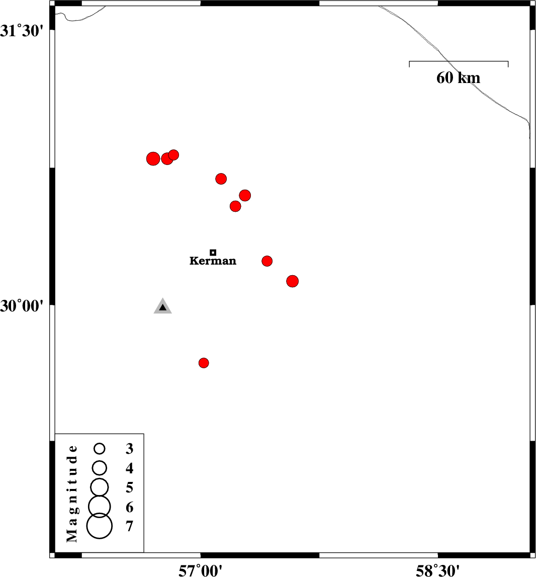 | 2010/11/17 | 10:14:02.6 | 13:44:02.6 | 30.54 | 57.22 | 15 | ML:3.1 | Kerman Province, 31 km North-East of Kerman |