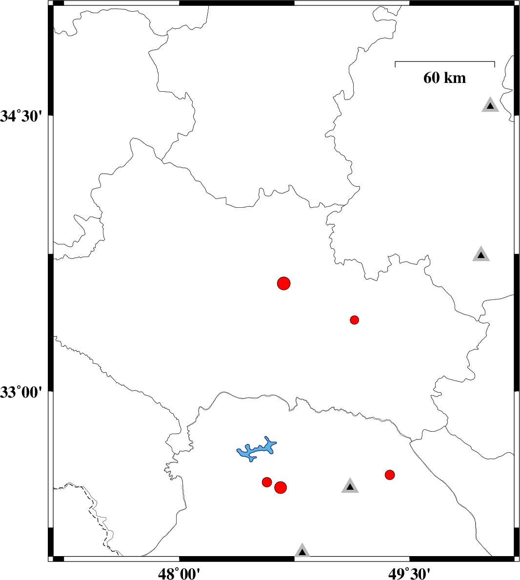 | 2010/12/13 | 15:00:27.5 | 18:30:27.5 | 33.59 | 48.68 | 14 | ML:3.8 | Lorestan Province, 35 km South of Borujerd | ||