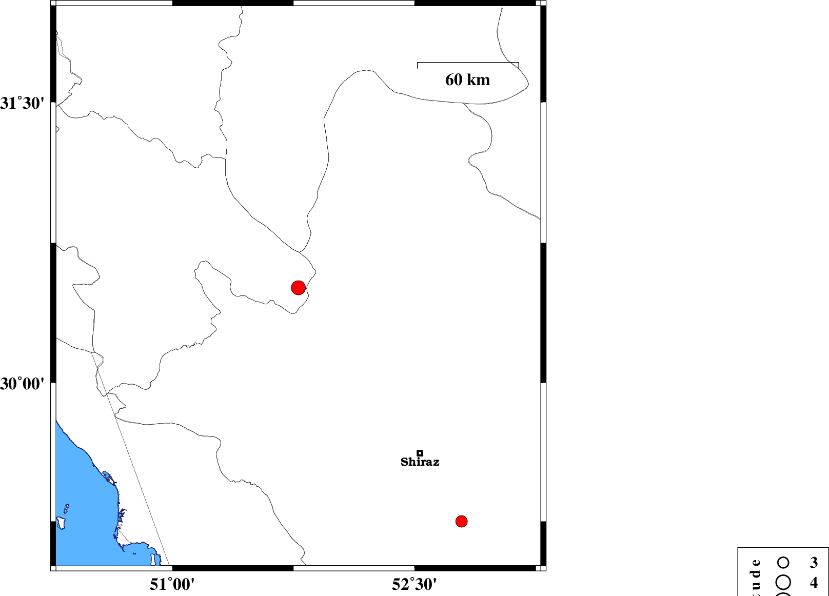 2011/01/02 | 07:46:05.1 | 11:16:05.1 | 30.51 | 51.78 | 33 | ML:4 | Kohkiluieh va boyerahmad Province, 27 km South-East of Yasuj | ||