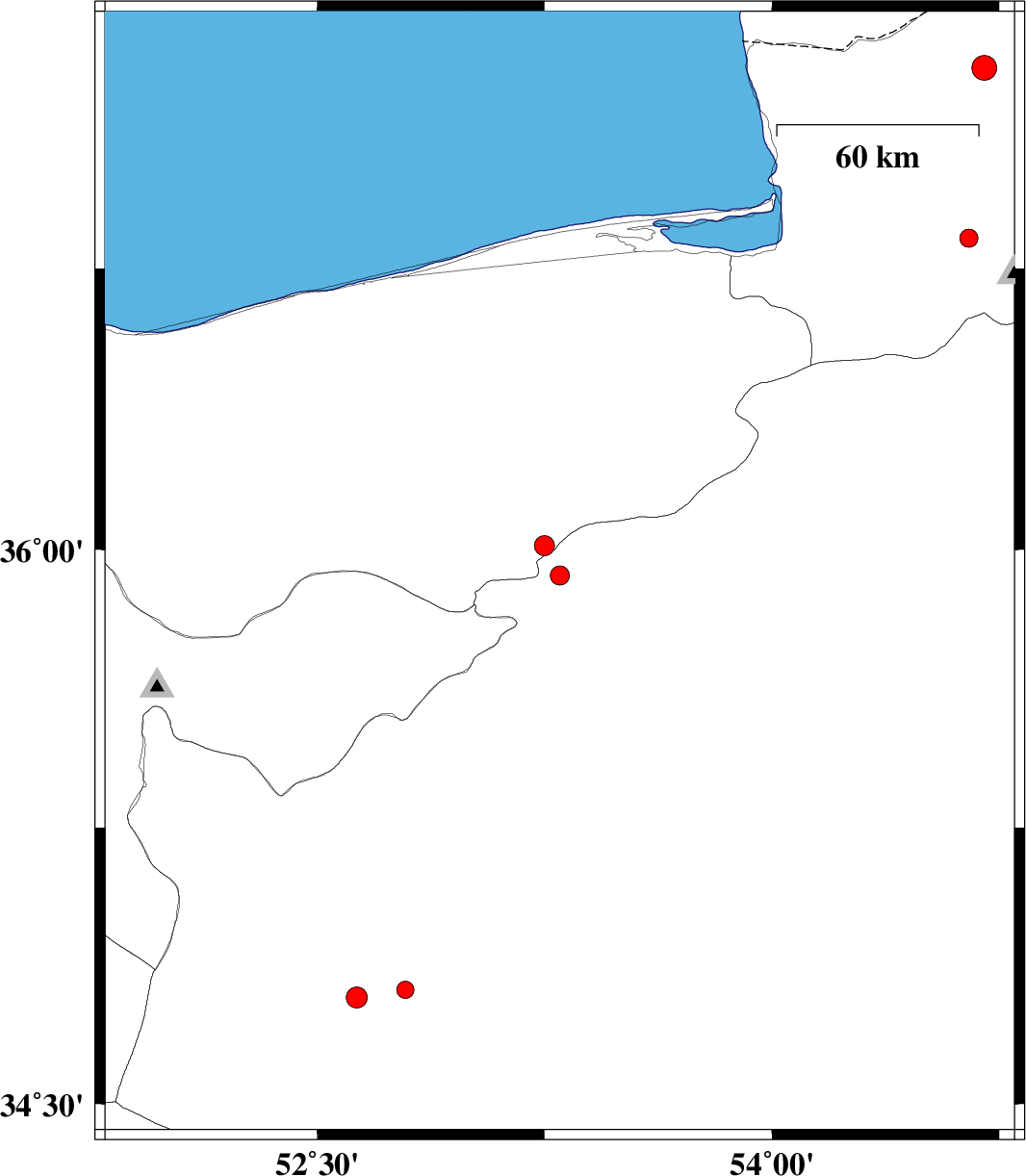 2011/01/03 | 00:48:21.5 | 04:18:21.5 | 35.93 | 53.3 | 14 | ML:2.8 | Semnan Province, 30 km South-East of Pol-E-Sefid | ||