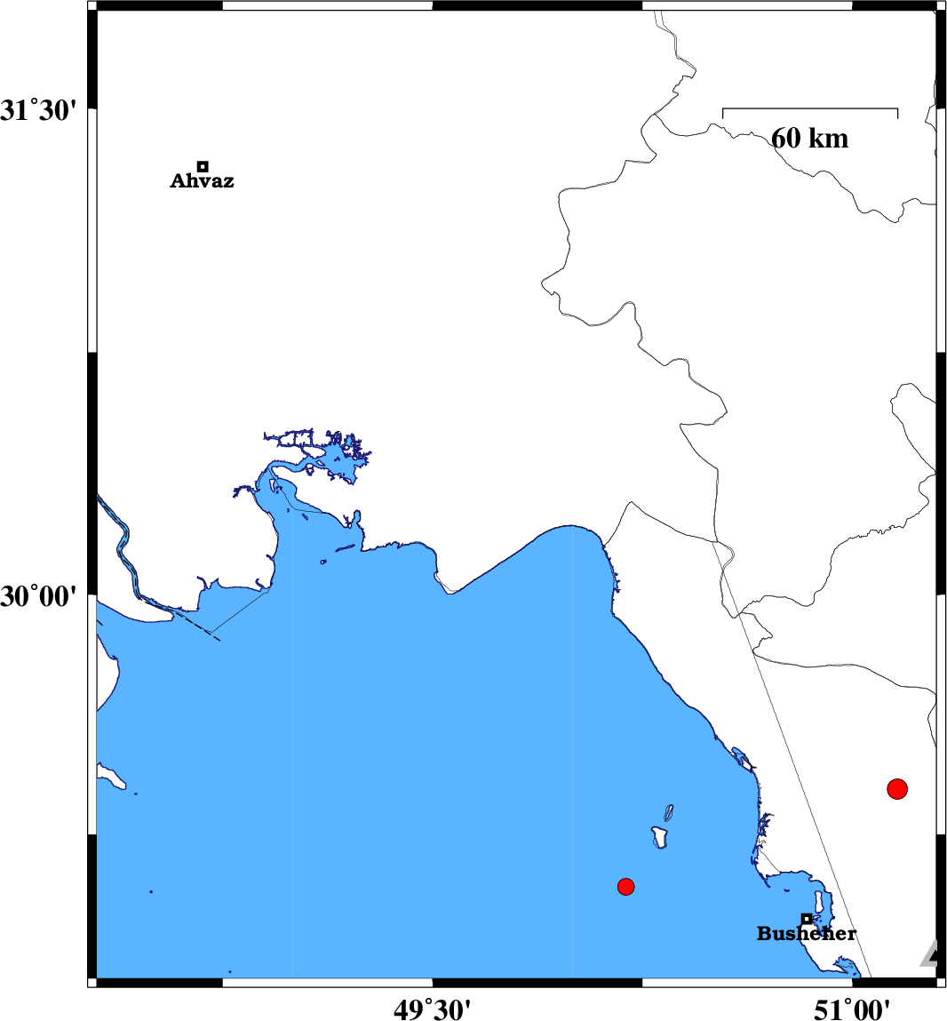 2011/01/03 | 13:37:55.9 | 17:07:55.9 | 30.3 | 49.8 | 15 | ML:4.2 | Khoozestan Province, 11 km Hendijan | ||