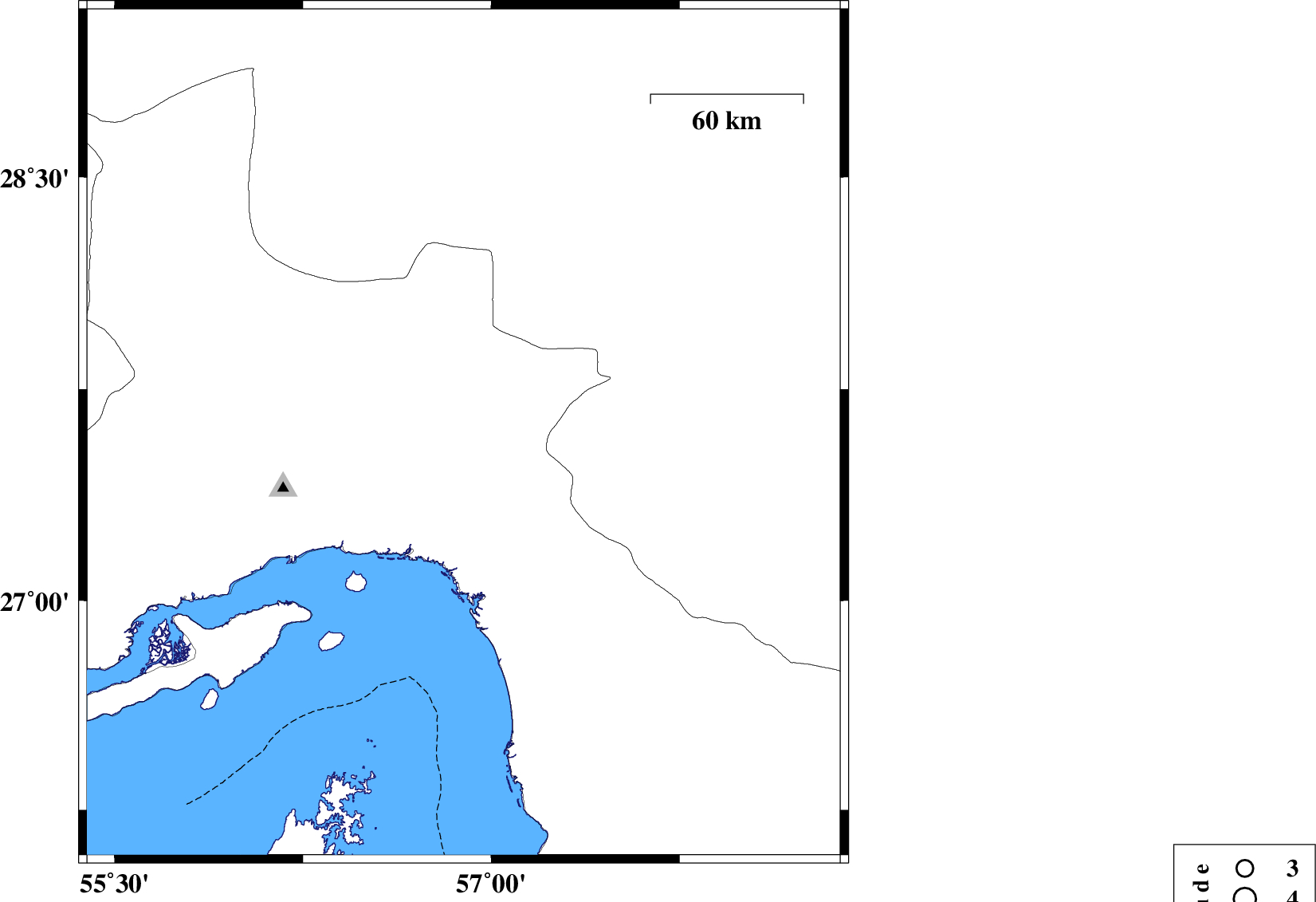 2011/01/06 | 00:45:08.2 | 04:15:08.2 | 27.59 | 56.89 | 30 | ML:3.1 | Hormozgan Province, 39 km North-West of Dehbarez |