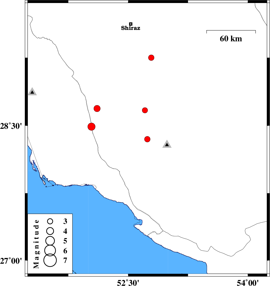 | 2011/01/08 | 20:42:43.7 | 00:12:43.7 | 28.35 | 52.74 | 15 | ML:3.3 | Fars Province, 31 km South-West of Qir va Karzin | ||
