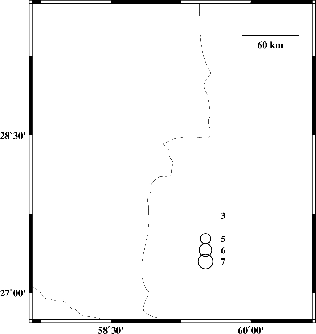 2011/01/03 | 00:17:35.8 | 03:47:35.8 | 28.53 | 59.19 | 46 | ML:2.8 | Kerman Province, 104 km South-East of Bam |