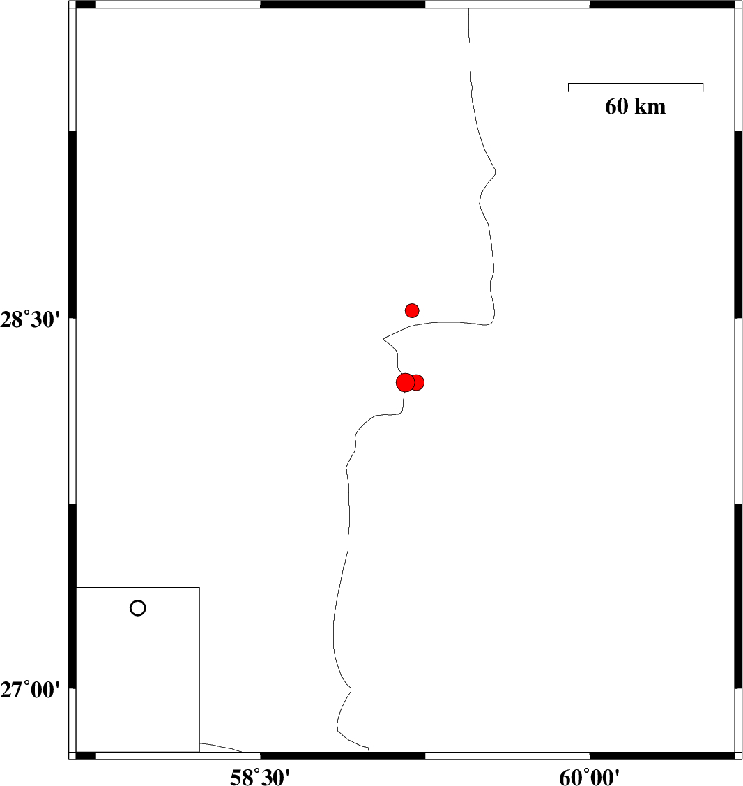 | 2011/01/03 | 00:17:35.8 | 03:47:35.8 | 28.53 | 59.19 | 46 | ML:2.8 | Kerman Province, 104 km South-East of Bam |
