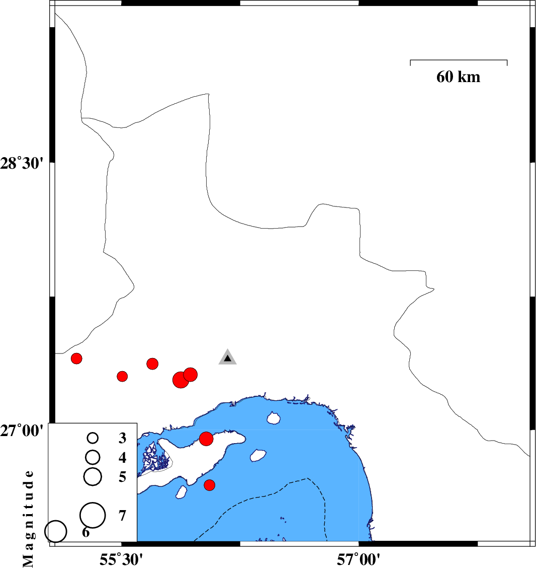 | 2011/01/14 | 21:54:11.0 | 01:24:11.0 | 26.72 | 55.54 | 43 | ML:2.9 | Persian Gulf, 72 km North-East of Bandar-e lengeh | ||