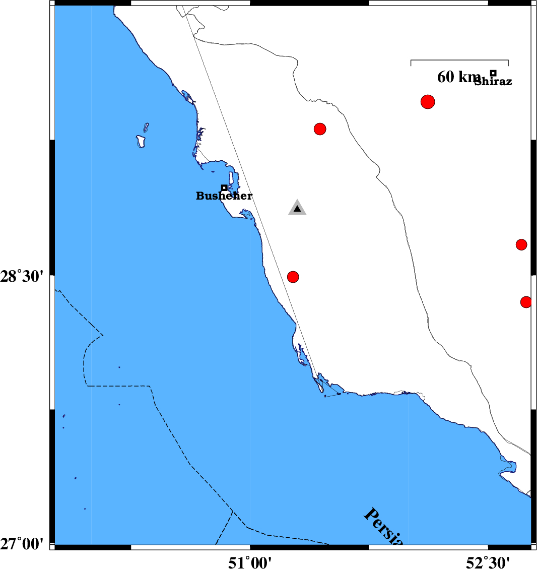 2011/01/08 | 20:42:43.7 | 00:12:43.7 | 28.35 | 52.74 | 15 | ML:3.3 | Fars Province, 31 km South-West of Qir va Karzin | ||