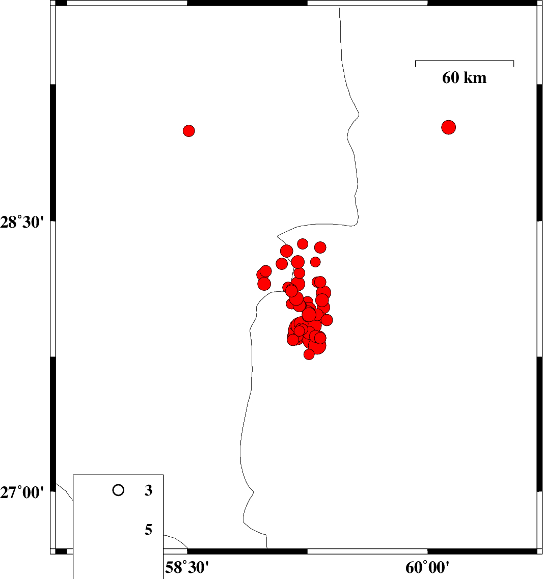 2011/01/27 08:43:27.5 12:13:27.5 28.159.1715 ML:5.3 Sistan va Baloochestan Province, 146 km North-East of Kahnuj