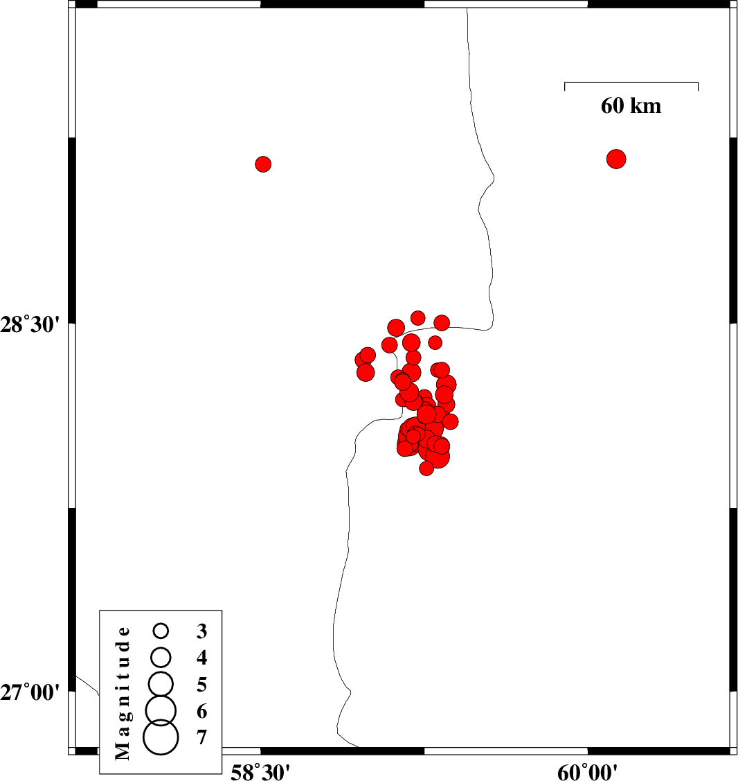 2011/01/27 08:38:28.5 12:08:28.5 28.1559.0915 Mb:6.2 Kerman Province, 139 km North-East of Kahnuj