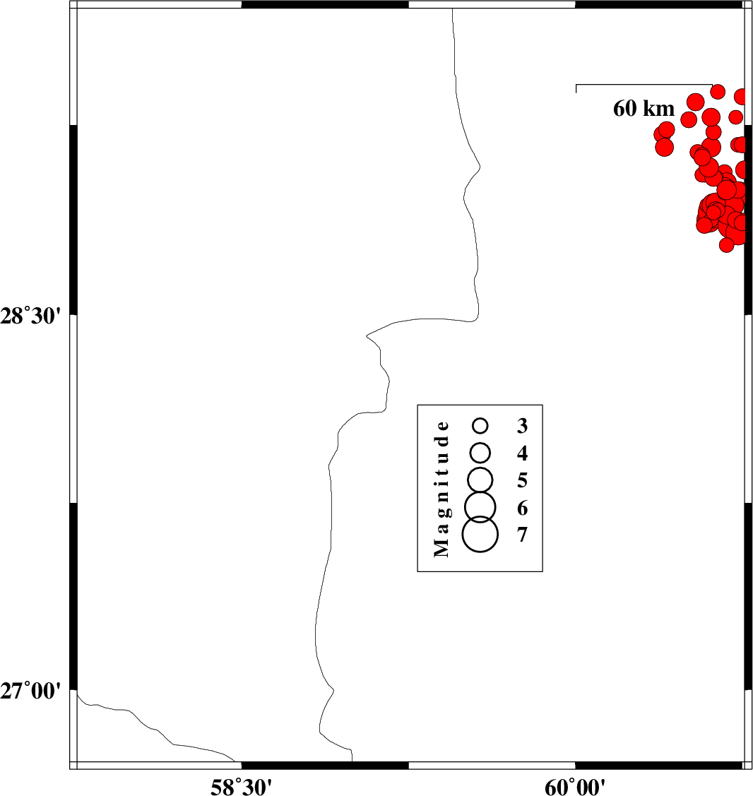 2011/01/27 08:38:28.5 12:08:28.5 28.1559.0915 Mb:6.2 Kerman Province, 139 km North-East of Kahnuj