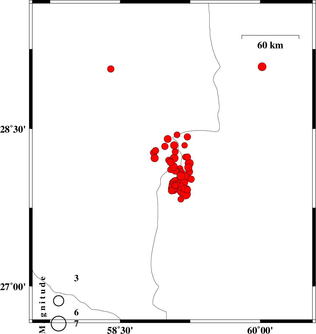 2011/01/27 08:38:28.5 12:08:28.5 28.1559.0915 Mb:6.2 Kerman Province, 139 km North-East of Kahnuj