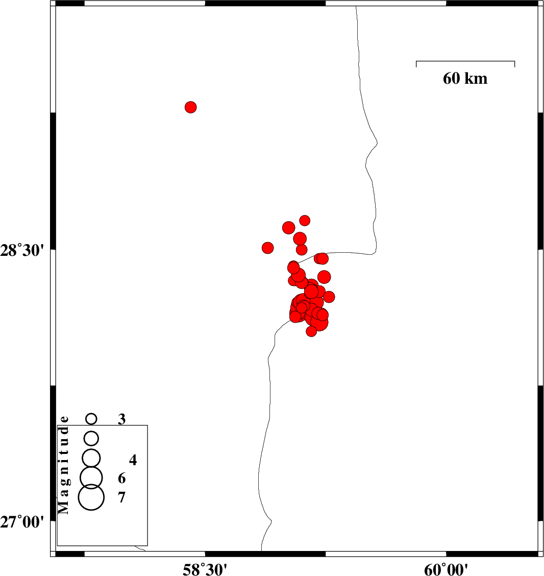 2011/01/27 08:38:28.5 12:08:28.5 28.1559.0915 Mb:6.2 Kerman Province, 139 km North-East of Kahnuj