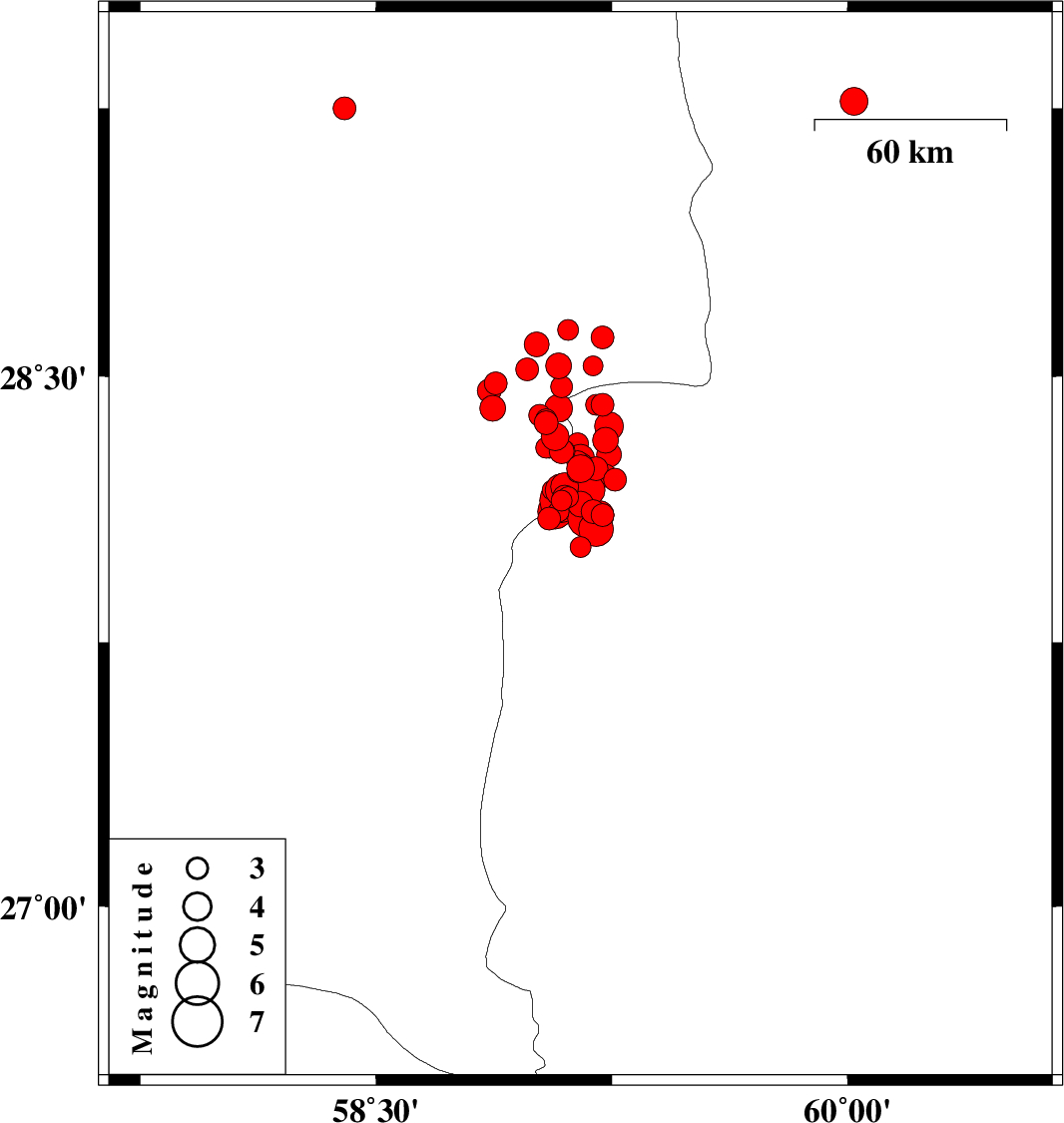 2011/01/27 08:38:28.5 12:08:28.5 28.1559.0915 Mb:6.2 Kerman Province, 139 km North-East of Kahnuj