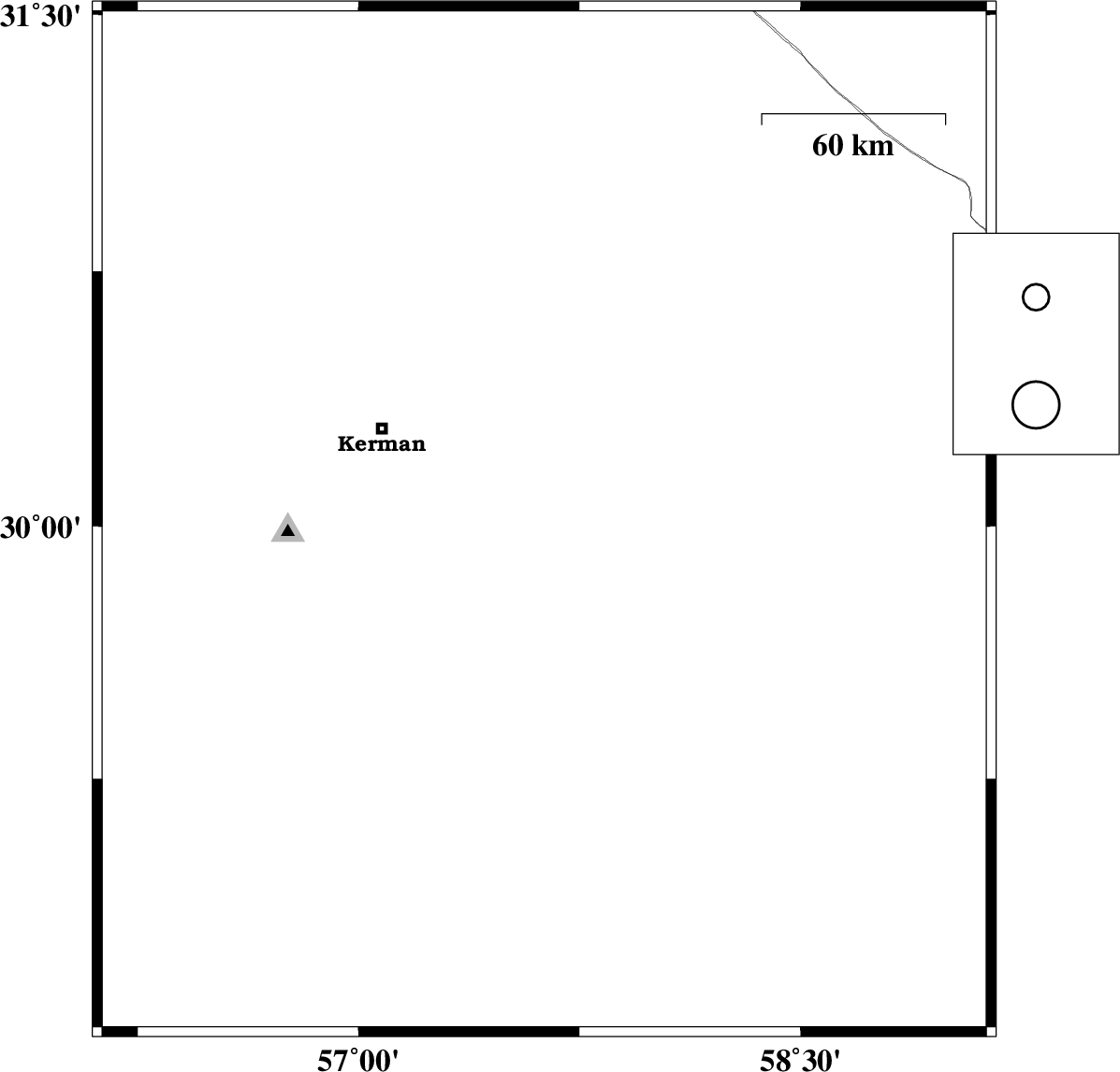 | 2011/01/27 | 09:47:30.6 | 13:17:30.6 | 28.63 | 59.11 | 15 | ML:3 | Kerman Province, 91 km South-East of Bam | ||