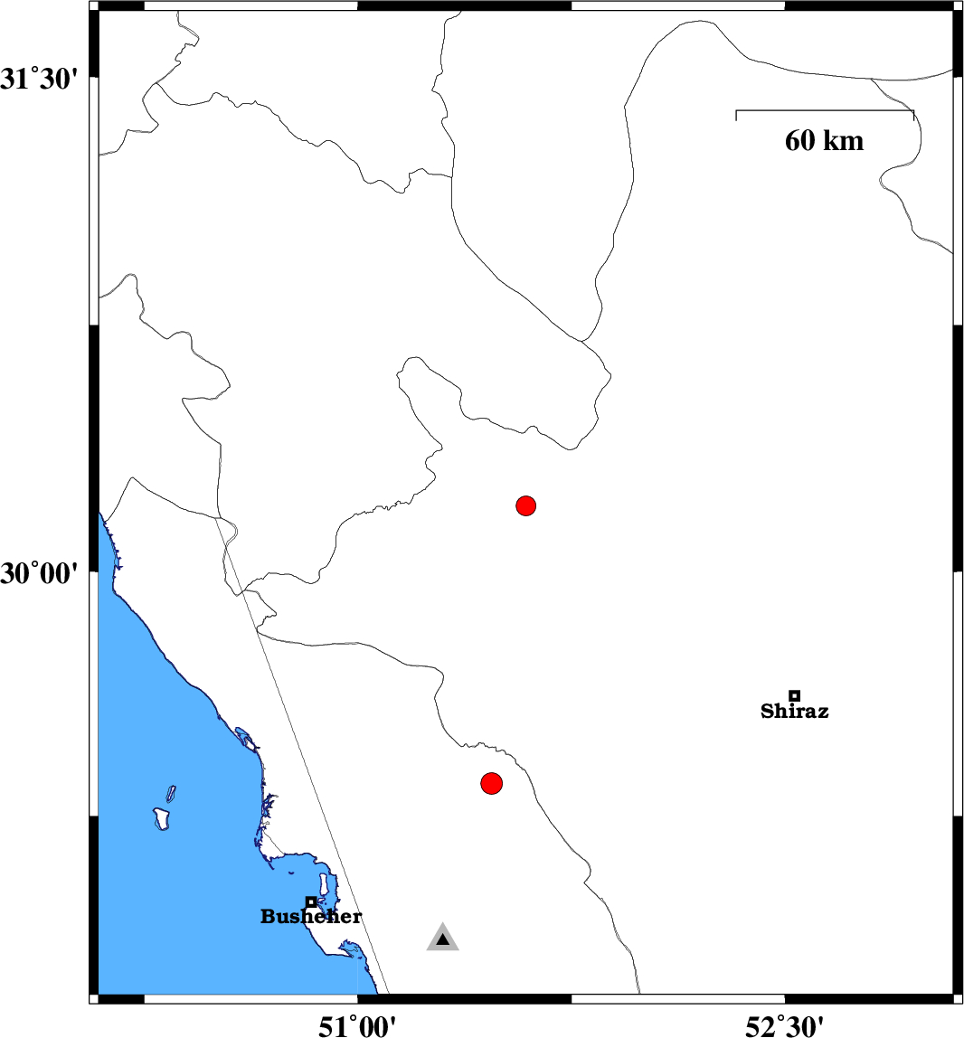 | 2011/02/09 | 18:11:06.7 | 21:41:06.7 | 29.35 | 51.47 | 15 | ML:3.4 | Bushehr Province, 27 km East of Borazjan |