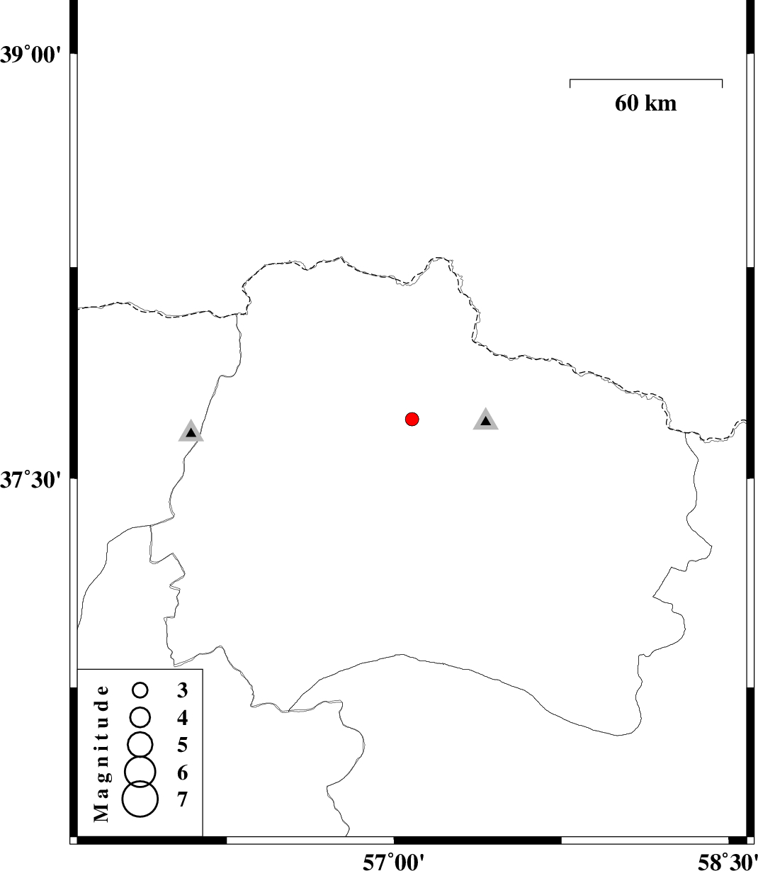 2011/02/11 | 15:35:00.4 | 19:05:00.4 | 37.71 | 57.08 | 17 | ML:2.7 | Khorasan(north) Province, 22 km North-East of Ashkhaneh | ||