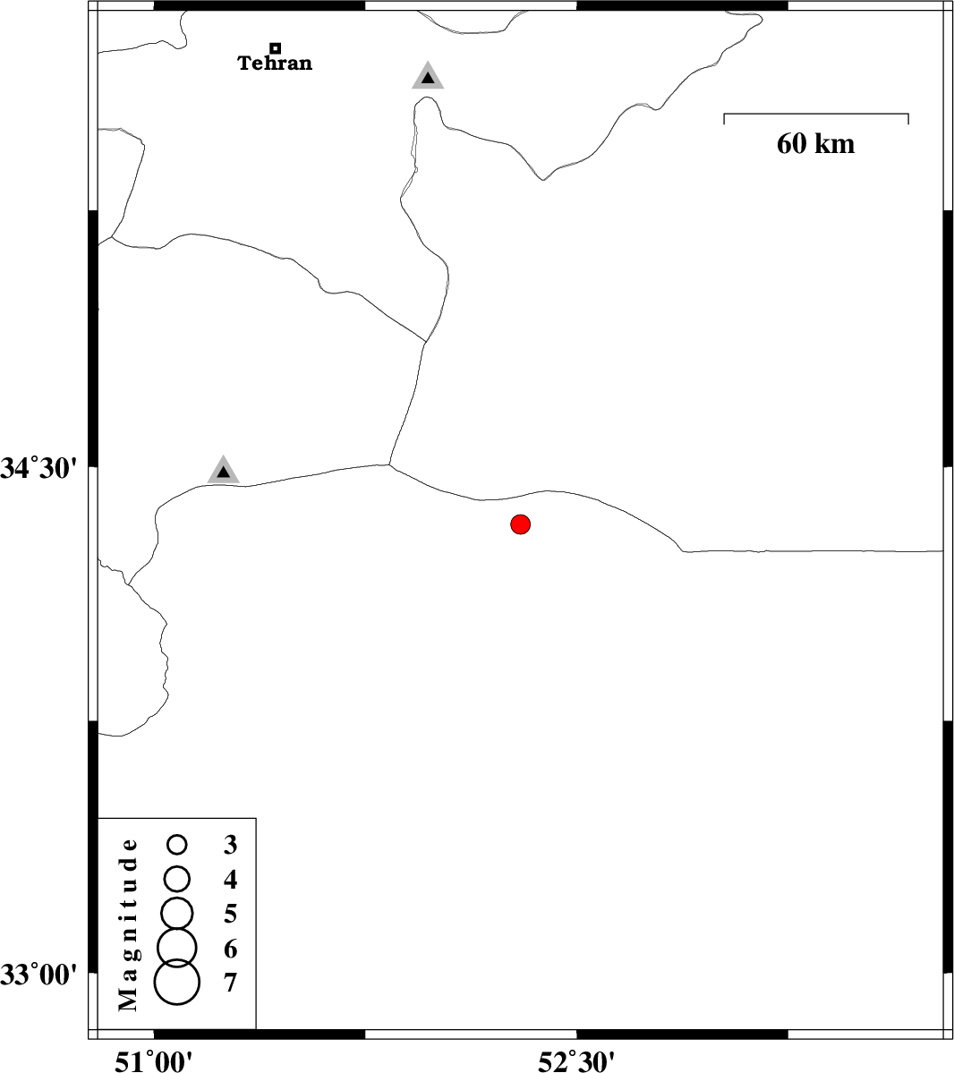 | 2011/02/12 | 07:19:36.2 | 10:49:36.2 | 34.33 | 52.3 | 14 | ML:3.1 | Esfahan Province, 98 km South of Garmsar | ||