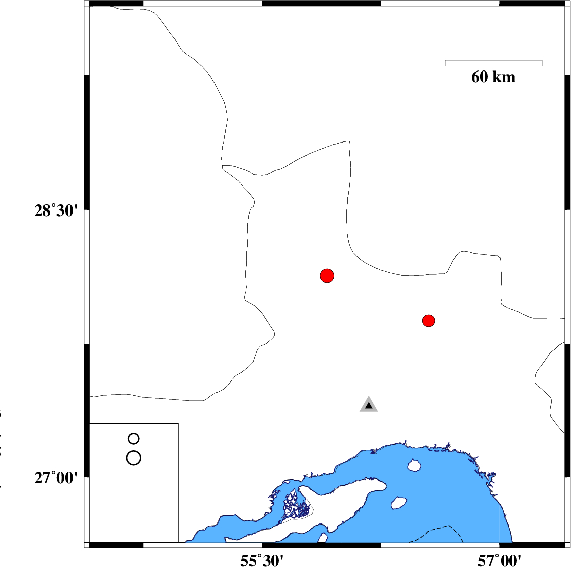 | 2011/02/18 | 17:13:26.5 | 20:43:26.5 | 26.71 | 54.46 | 14 | ML:3.6 | Hormozgan Province, 44 km North-West of Bandar-e lengeh | ||