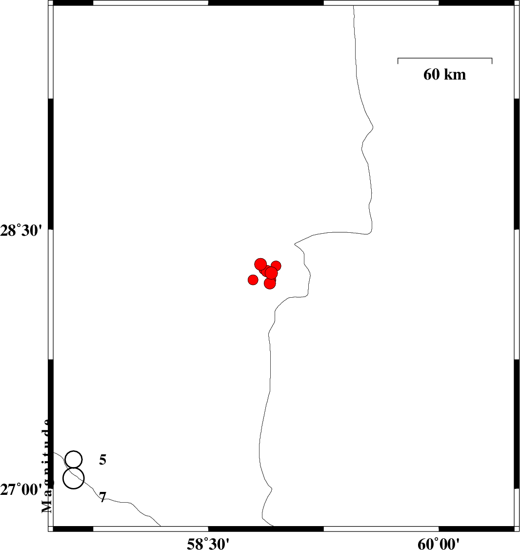 | 2011/02/19 | 01:07:27.5 | 04:37:27.5 | 28.28 | 58.99 | 14 | ML:3.5 | Kerman Province, 111 km South-East of Bam | ||