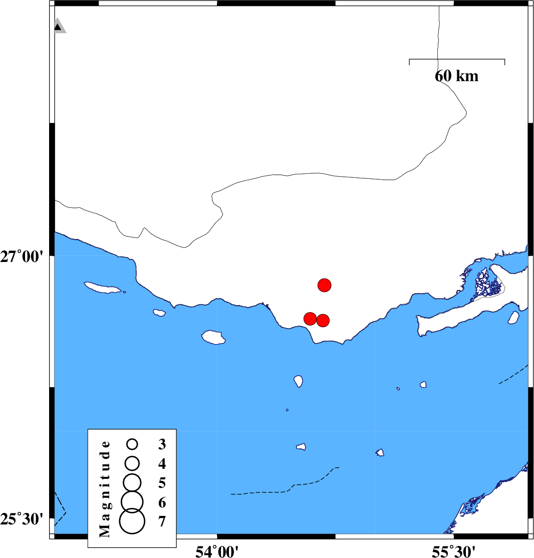 | 2011/02/18 | 17:13:26.5 | 20:43:26.5 | 26.71 | 54.46 | 14 | ML:3.6 | Hormozgan Province, 44 km North-West of Bandar-e lengeh | ||