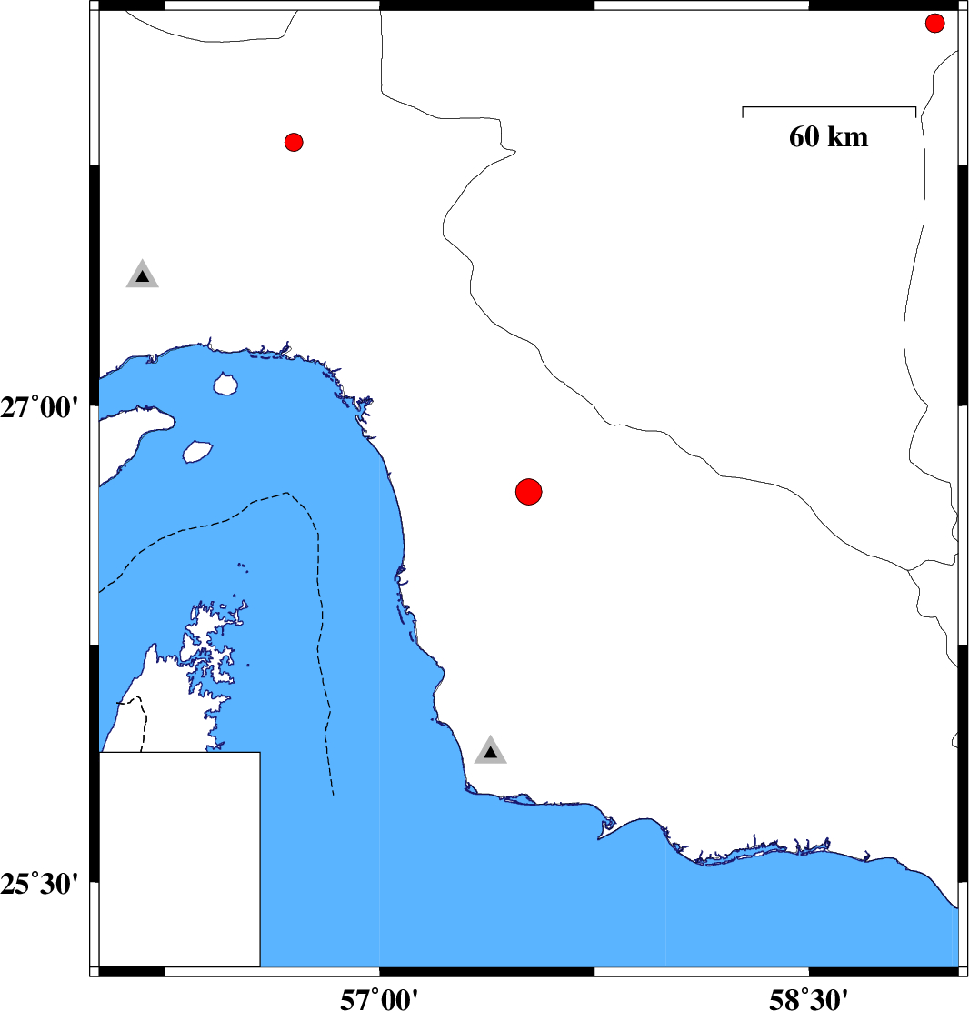 | 2011/02/22 | 22:21:59.0 | 01:51:59.0 | 27.82 | 56.7 | 15 | ML:2.8 | Hormozgan Province, 68 km North-West of Dehbarez | ||