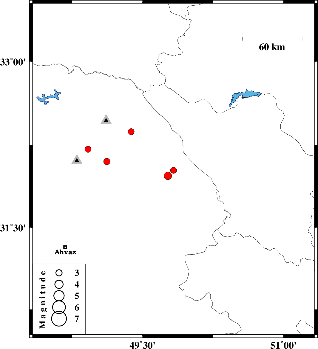 | 2011/02/24 | 06:16:51.2 | 09:46:51.2 | 32.21 | 48.92 | 26 | ML:3 | Khoozestan Province, 19 km North of Shushtar | ||