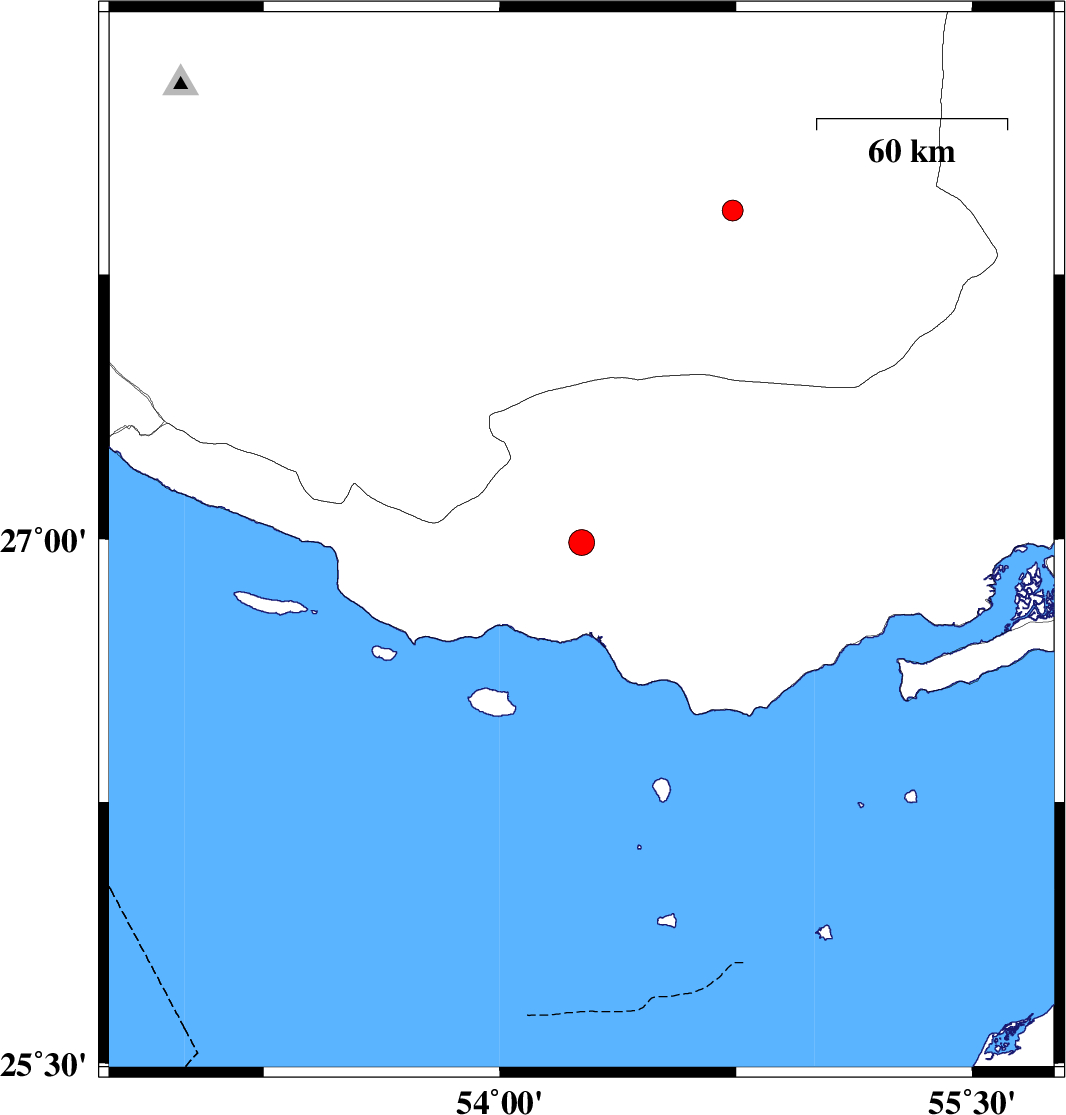 | 2011/03/02 | 23:19:14.6 | 02:49:14.6 | 26.99 | 54.26 | 18 | ML:3.6 | Hormozgan Province, 26 km South-West of Bastak | ||